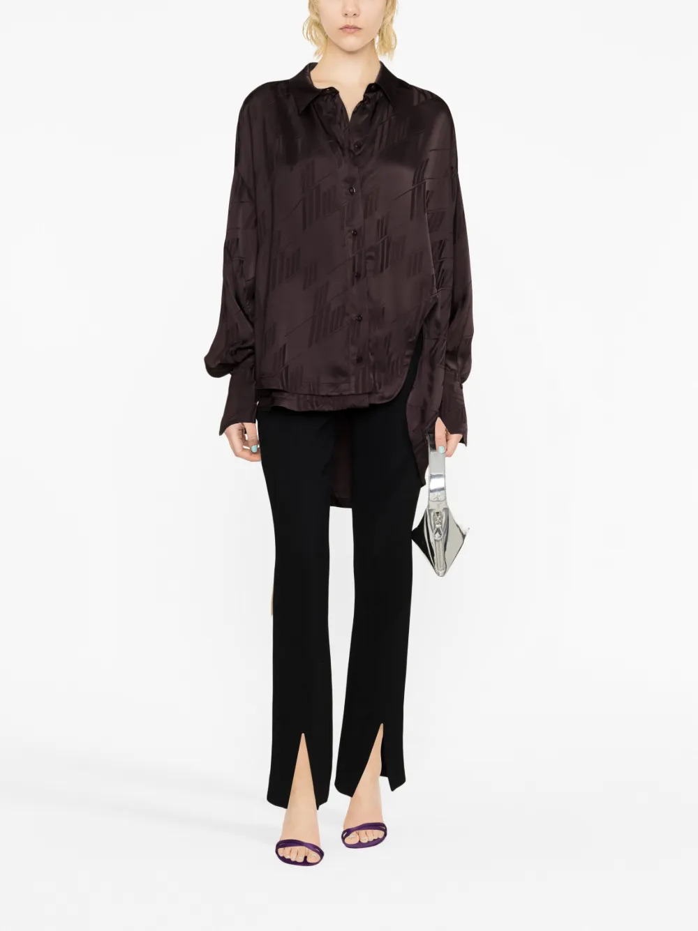 Шоколадный, сплошной принт с логотипом, классический воротник, застежка на пуговицах спереди, длинные рукава, манжеты на пуговицах, асимметричный подол и вырезные детали.