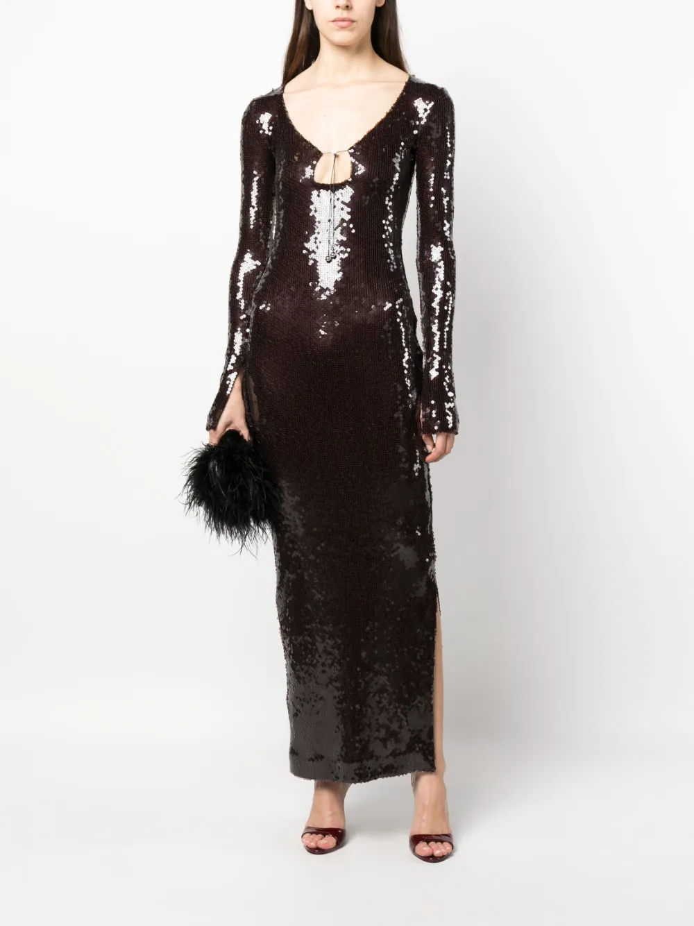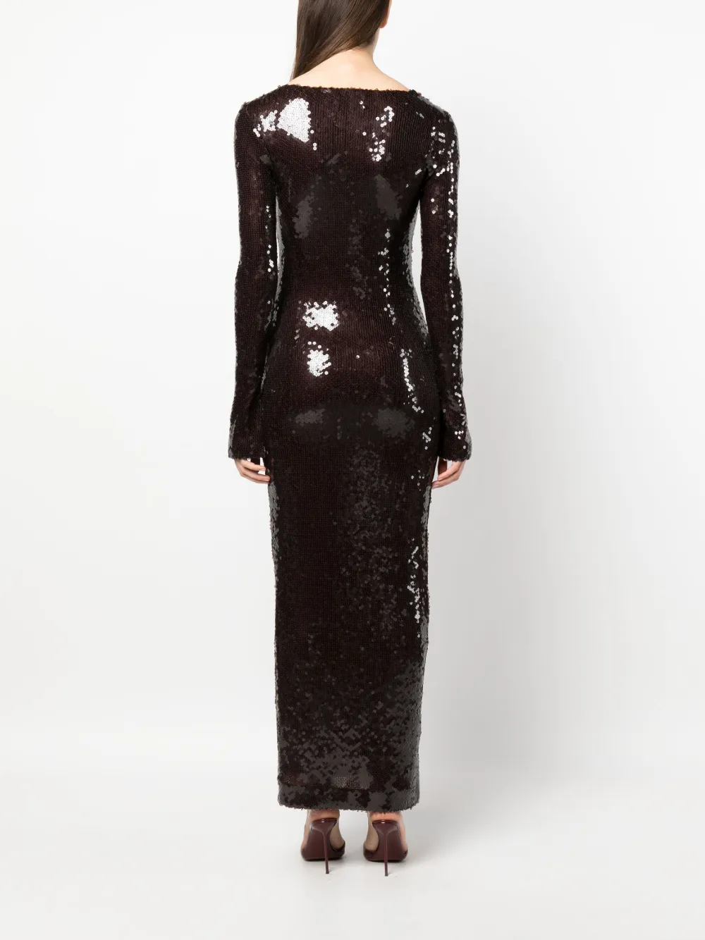 Шоколадный, пайетки, завязки спереди, длинные рукава, боковой разрез и высота по щиколотку.