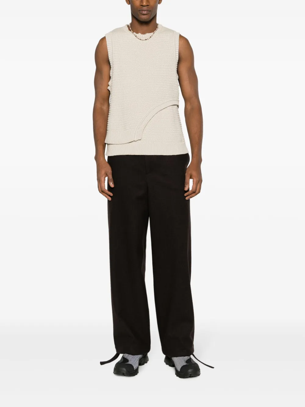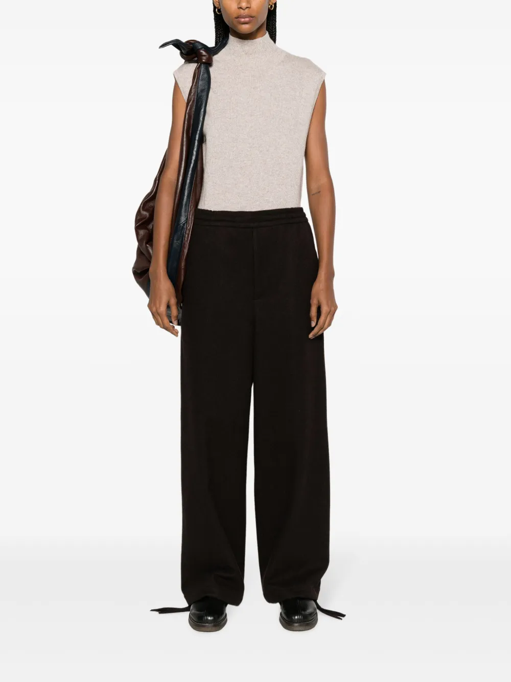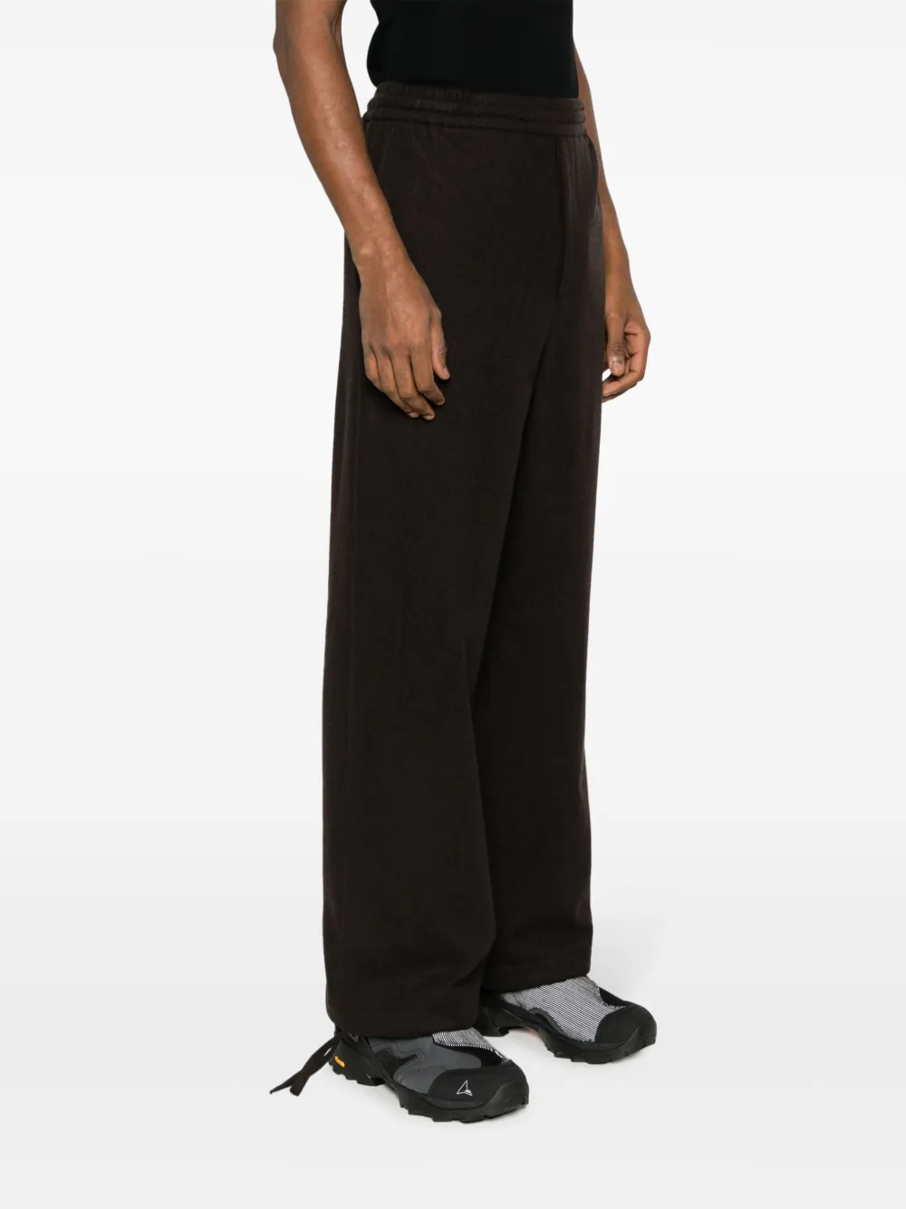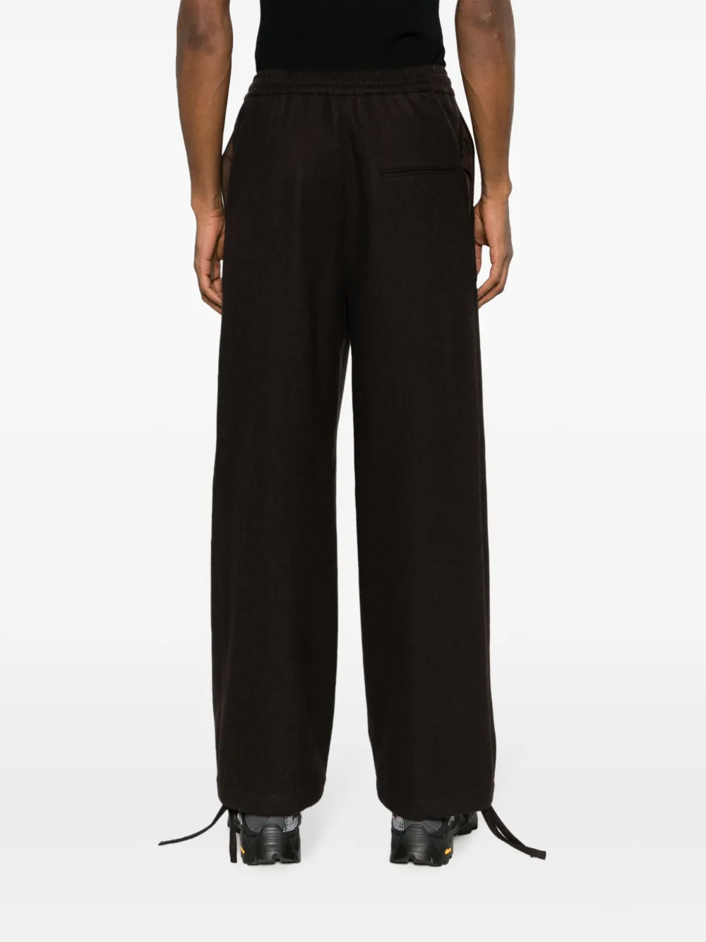 Серо-коричневый, смесовая шерсть, средняя посадка, эластичный пояс, застежка на молнии спереди, два прорезных кармана по бокам, задние карманы с листочкой, прямой крой и манжеты с завязками. Это унисекс-модель. Обратите внимание, что для нее используется мужская размерная сетка.