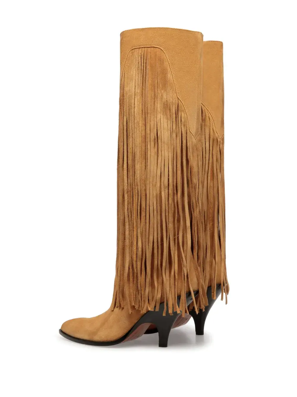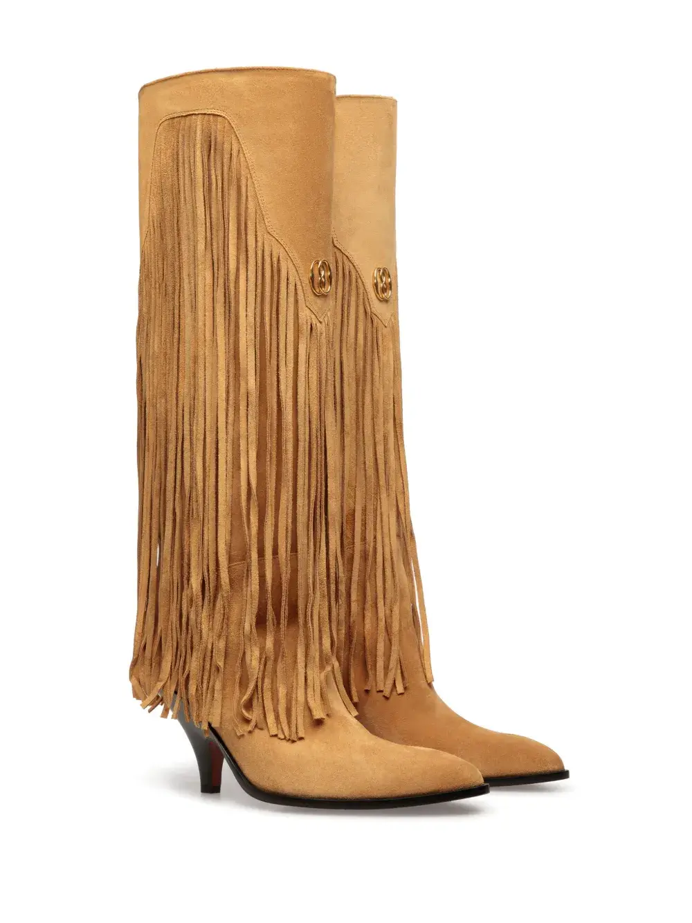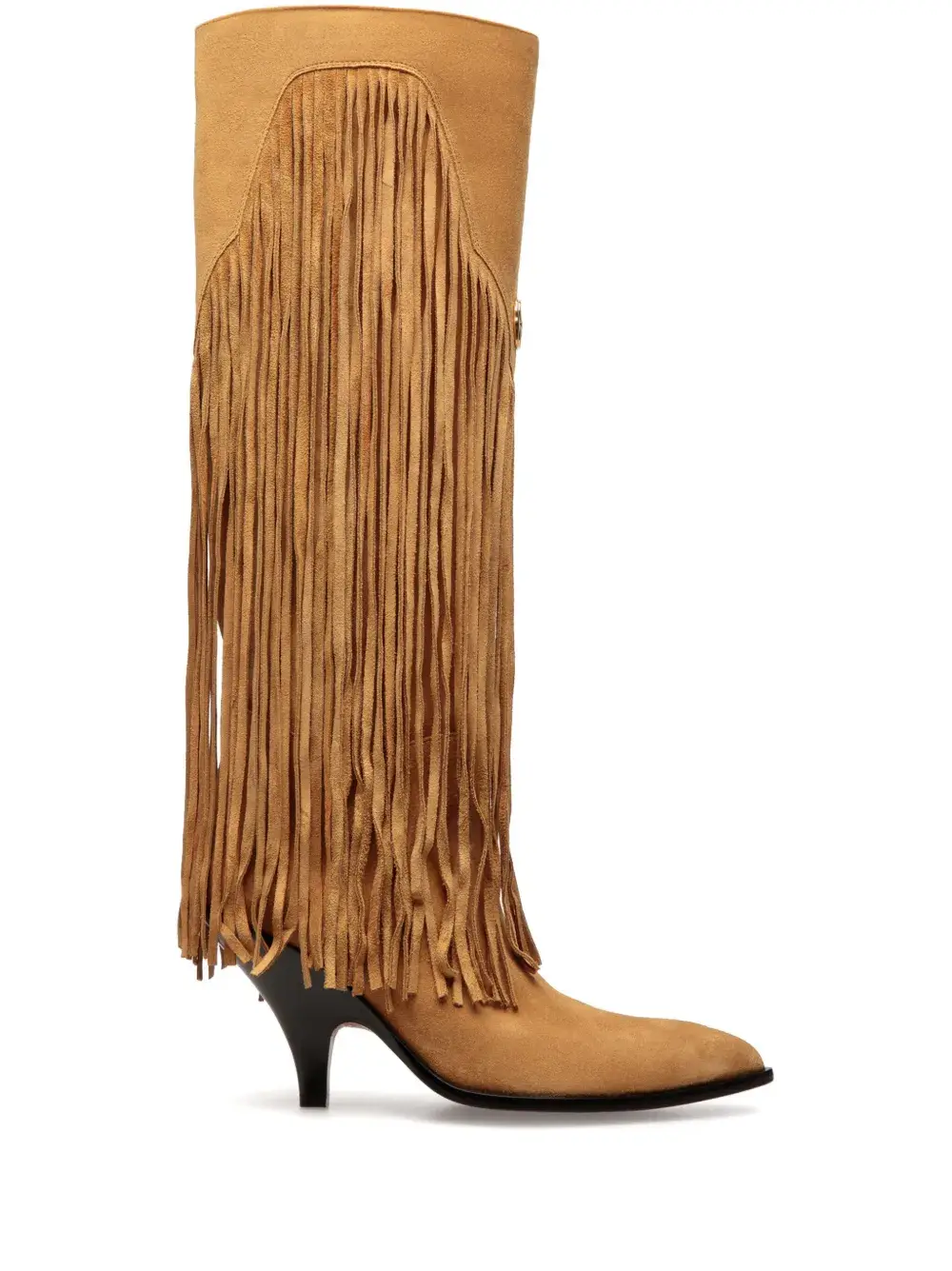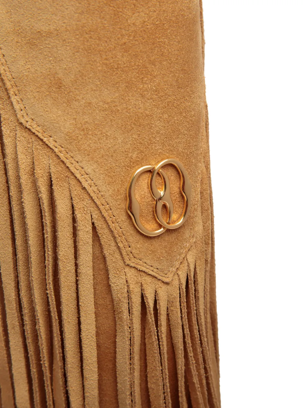 Бежево-коричневый, замша из телячьей кожи, золотистый металлический логотип, бахрома, миндалевидный носок, кожаная стелька с логотипом, высота по колено, модель без застежки и каблук средней высоты.