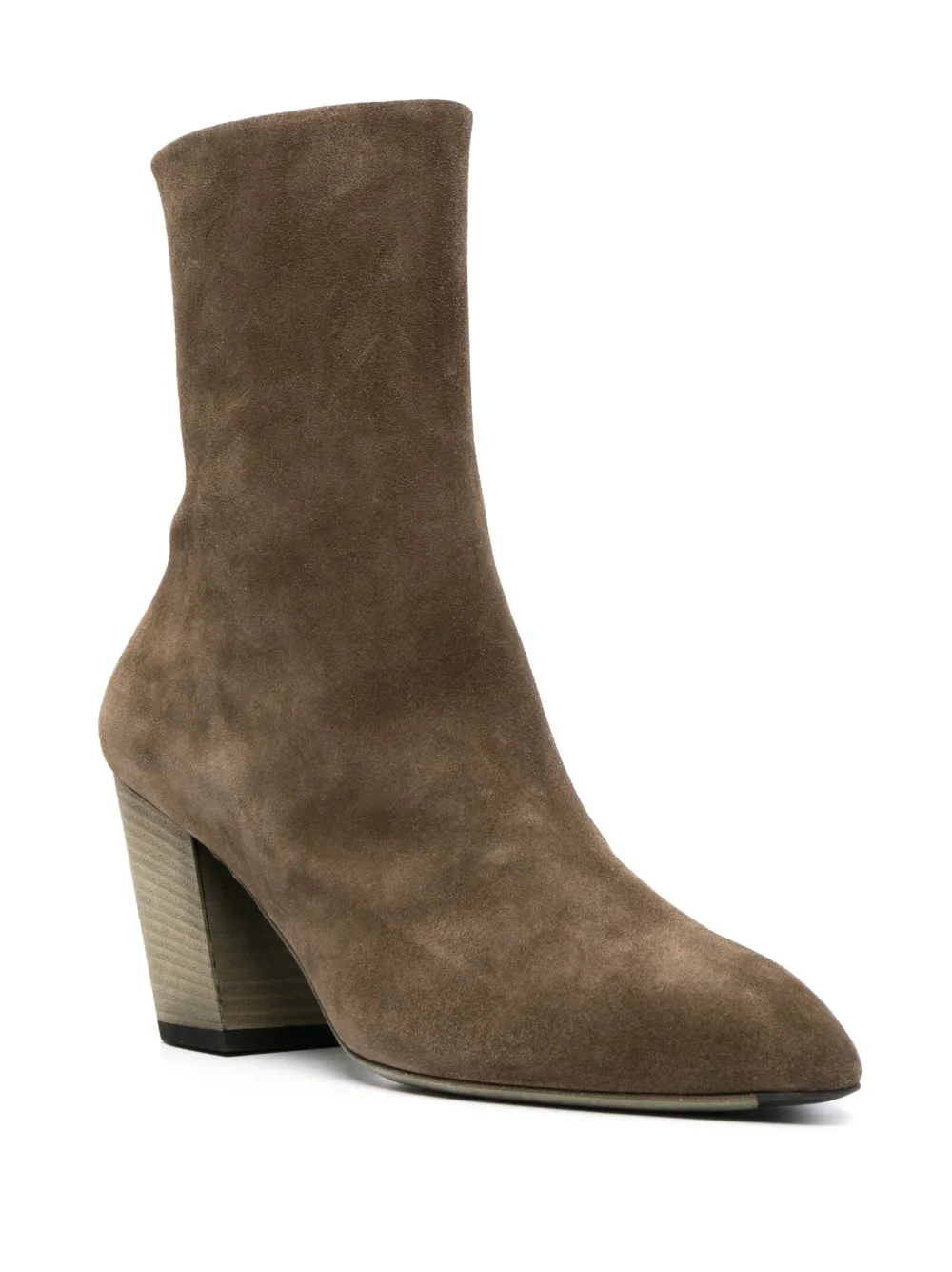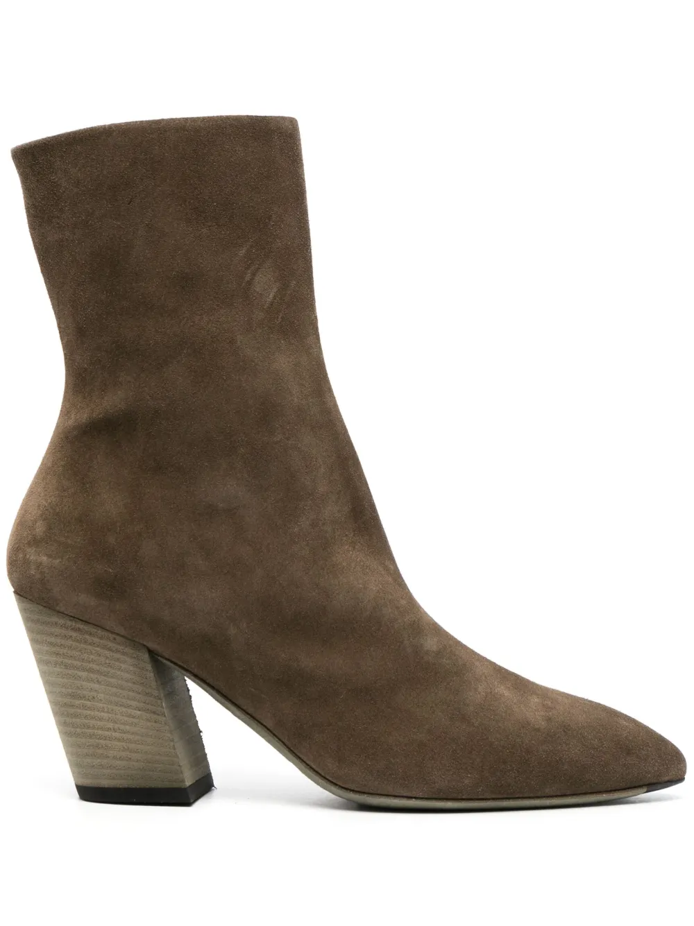 Серо-коричневый, замша из телячьей кожи, телячья кожа, заостренный носок, застежки на молнии сбоку, высота по щиколотку и кубинский каблук.