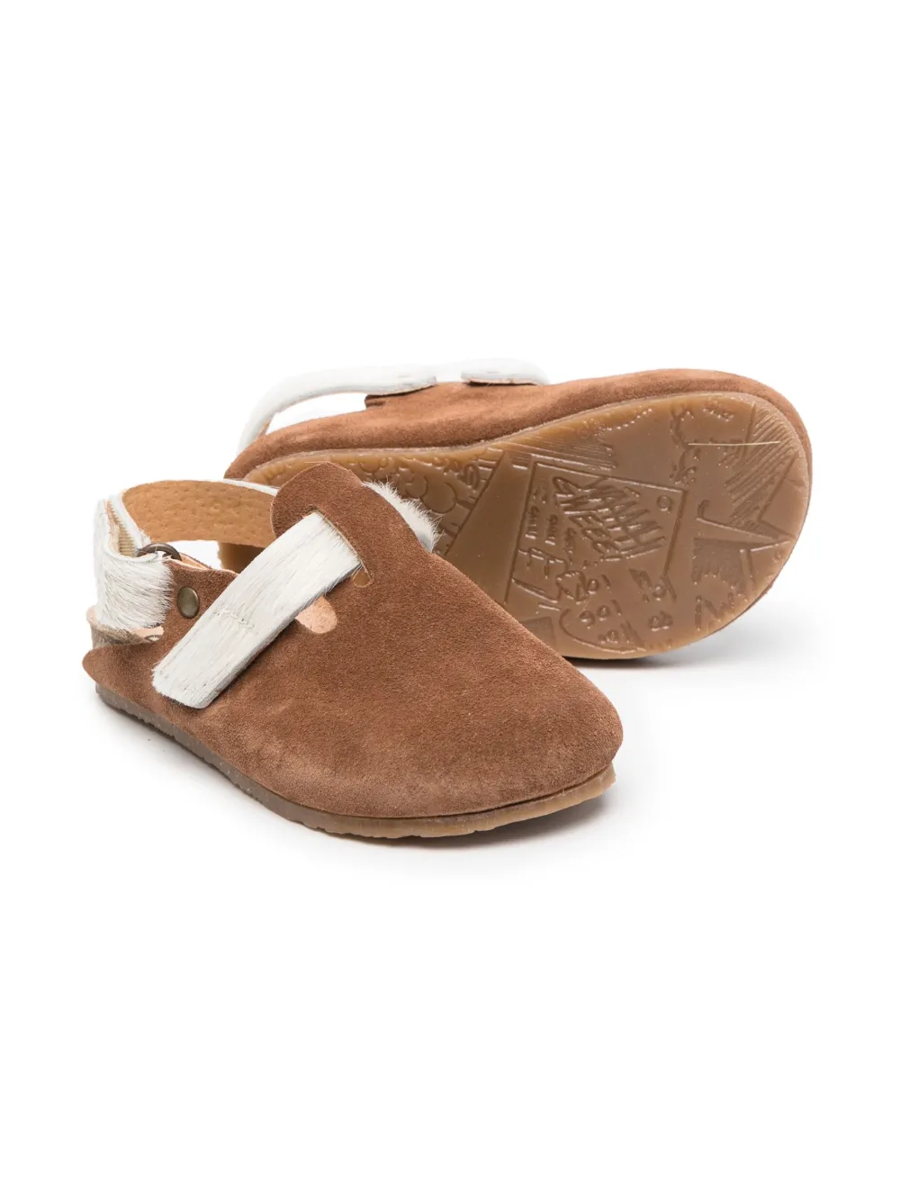 Каштановый, кремовый, замша из телячьей кожи, мех пони, фурнитура с состаренным эффектом, закругленный носок, застежка на липучке сбоку, застежка на липучке, открытая спина, формованная стелька и кожаная стелька с логотипом.