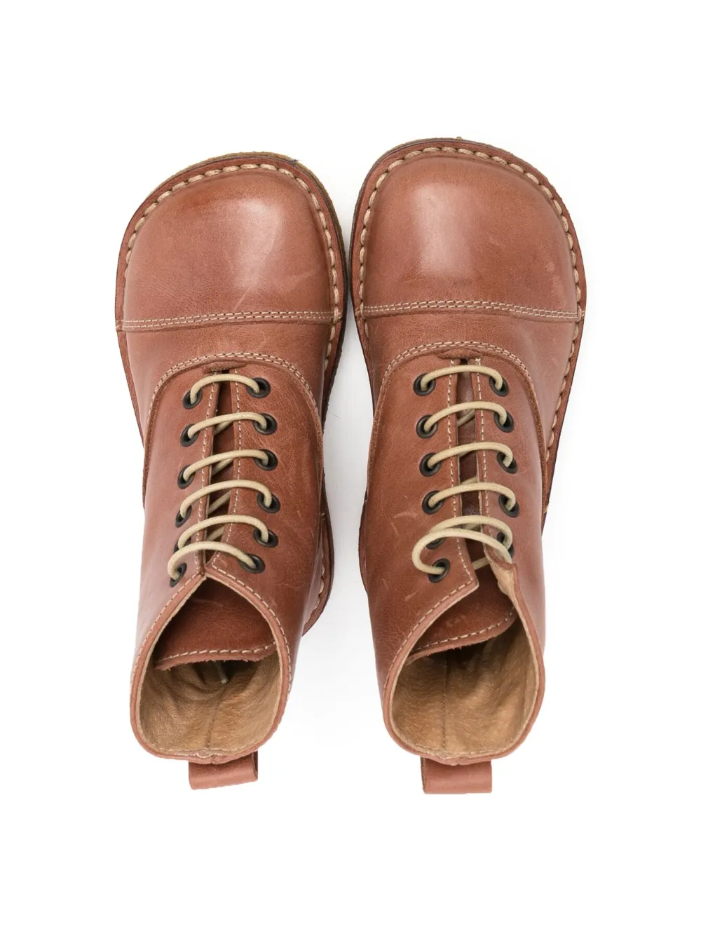 Каштановый, телячья кожа, гладкая текстура кожи, эффект потертости, контрастная строчка, закругленный носок, отделка металлическими люверсами, шнуровка спереди, контрастные шнурки, петля для подтягивания сзади, кожаная стелька с логотипом и креповая подошва.