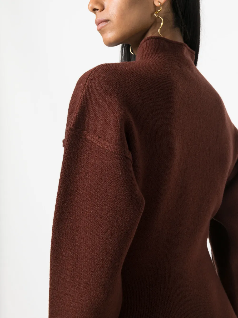 Декоративные швы, приспущенные плечи и воротник-стойка.