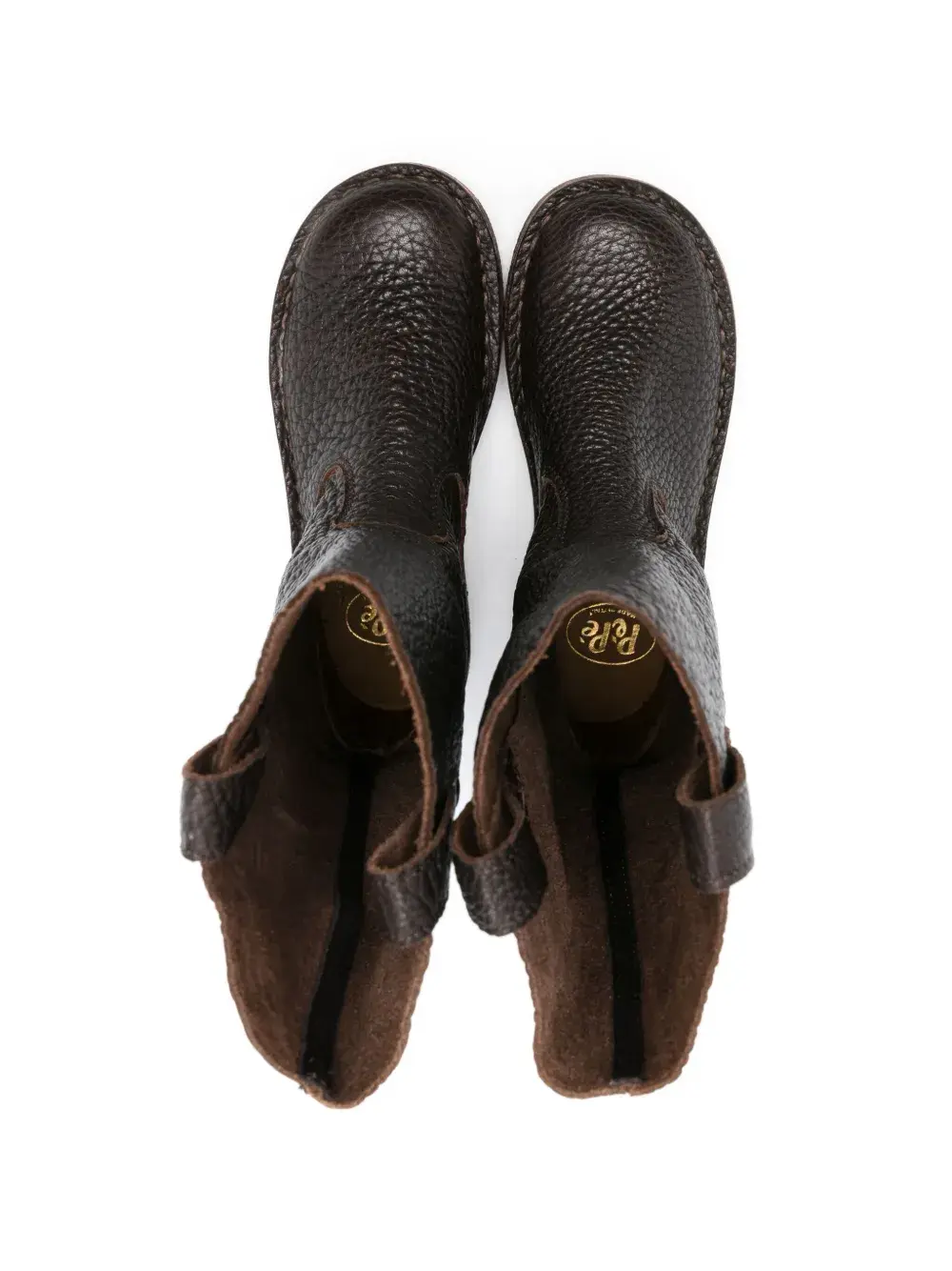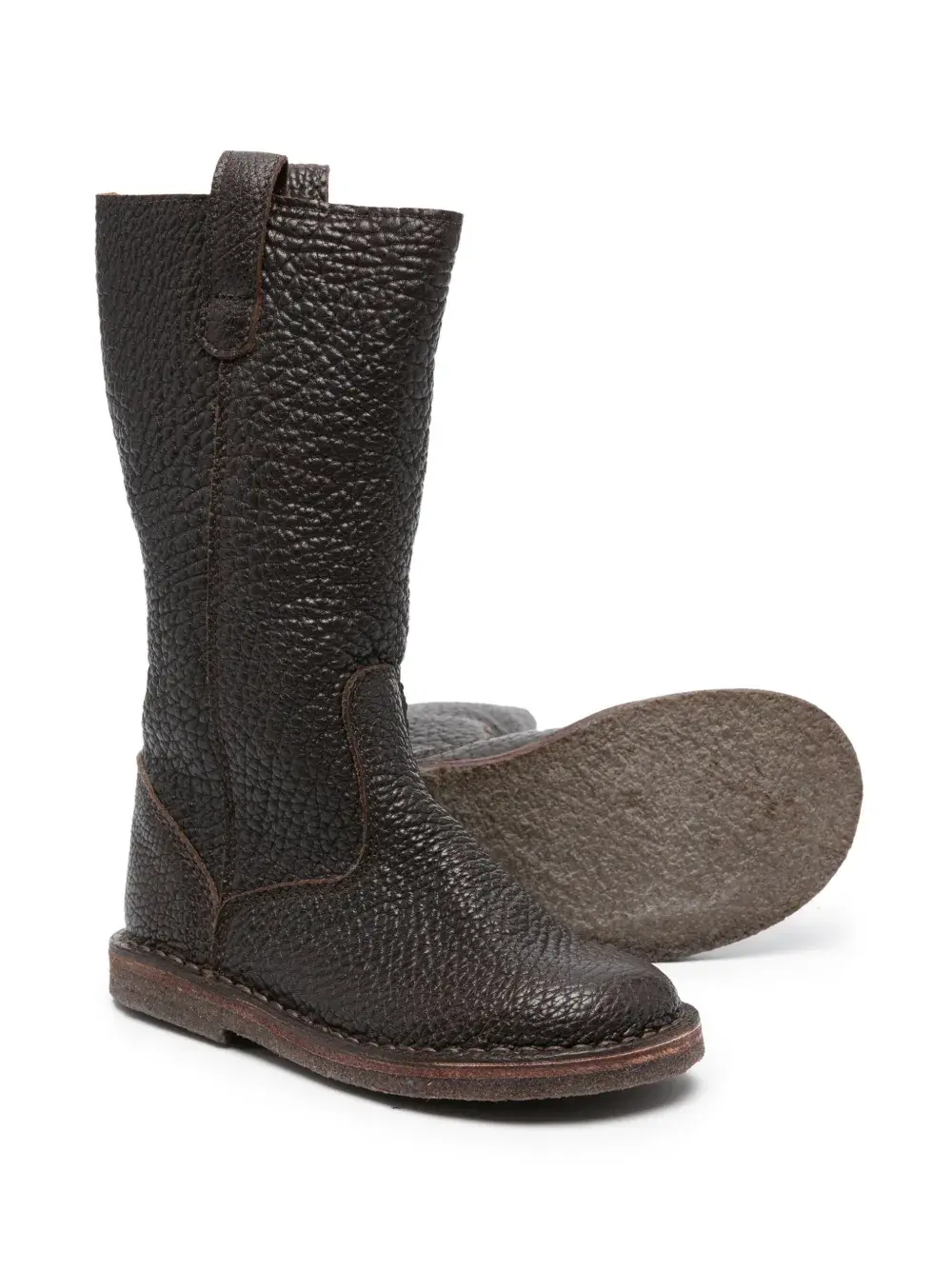 Шоколадный, телячья кожа, жатый эффект, двойная петля для подтягивания, закругленный носок, высота по колено, кожаная подкладка и плоская резиновая подошва.