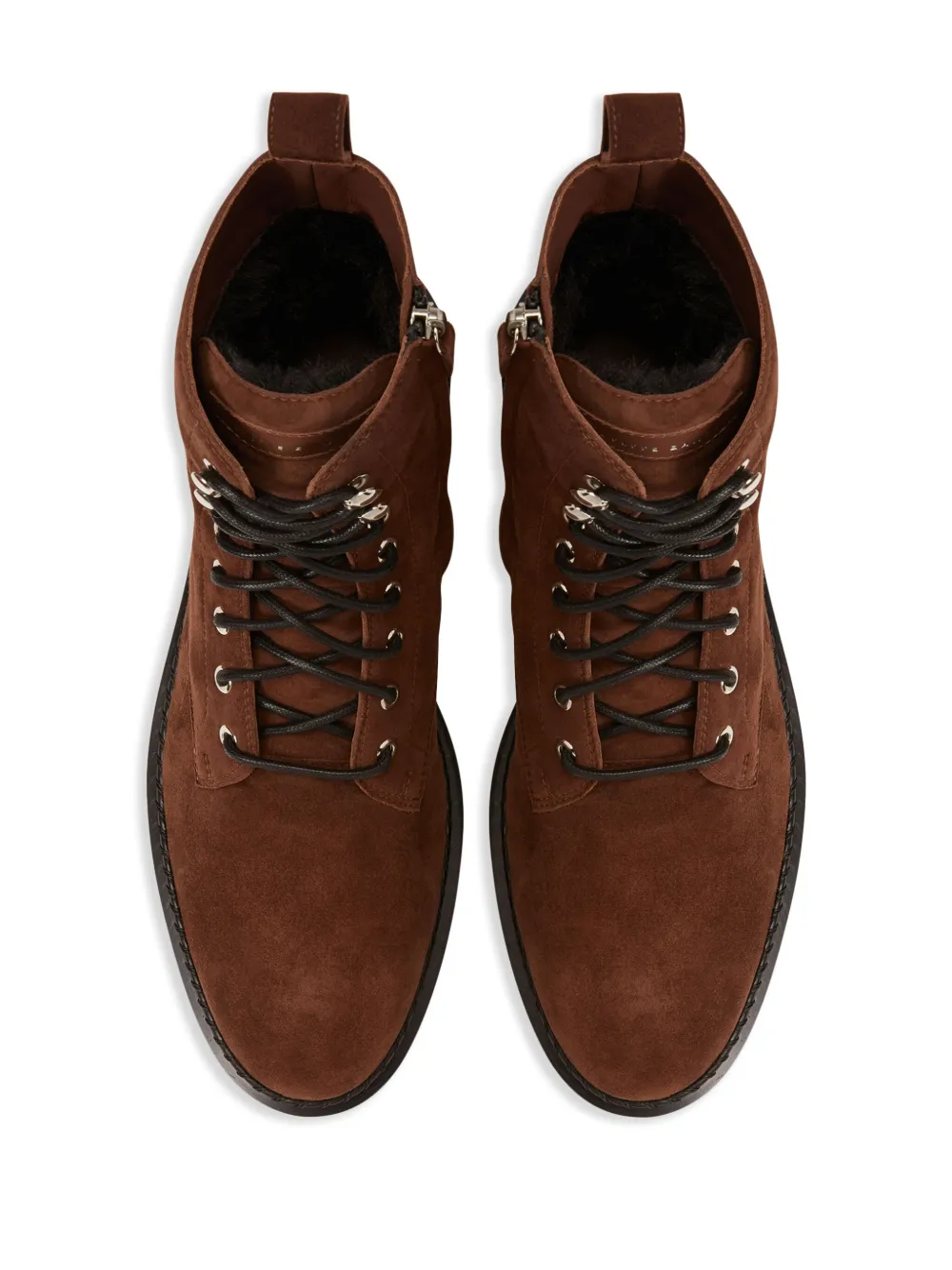 Шоколадный, замша, миндалевидный носок, шнуровка спереди, тисненый логотип на язычке, высота по щиколотку, застежка на молнии сбоку, петля для подтягивания сзади и плоская резиновая подошва.