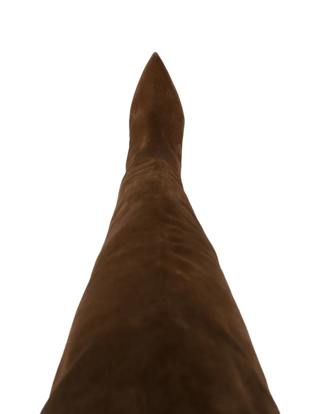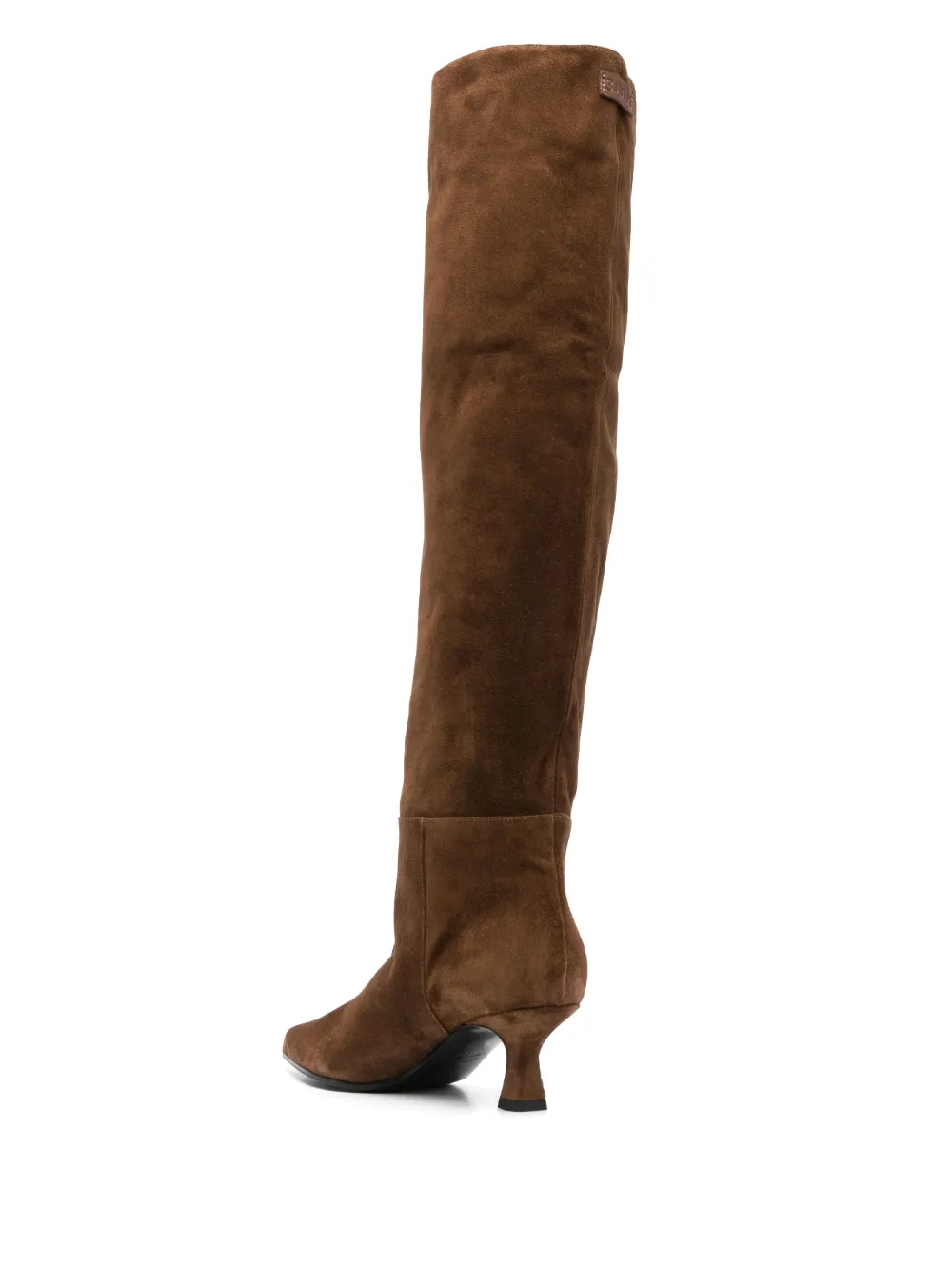 Шоколадный, телячья кожа, замша из телячьей кожи, длина по колено, заостренный носок, модель без застежки и скульптурный каблук средней высоты.