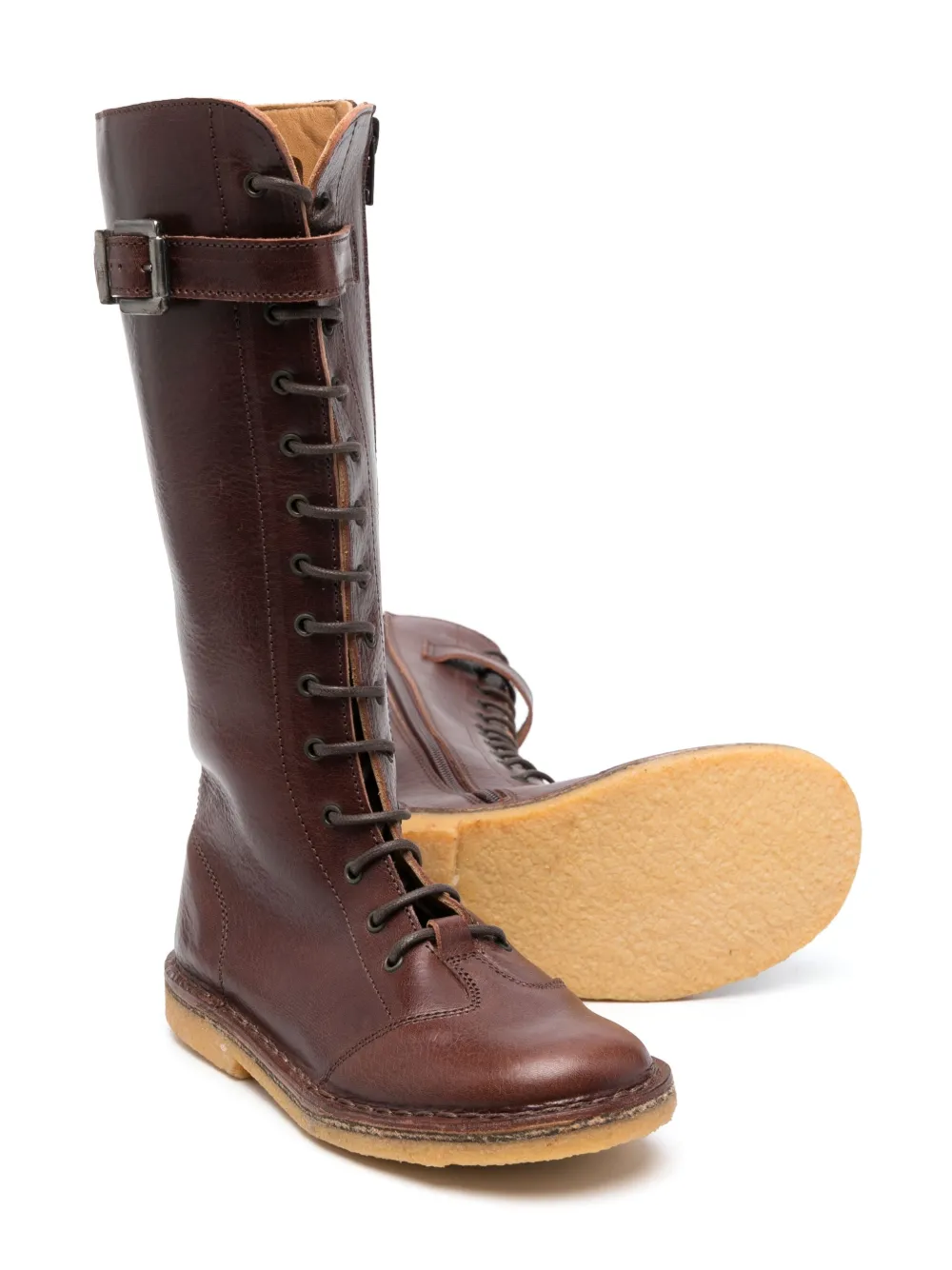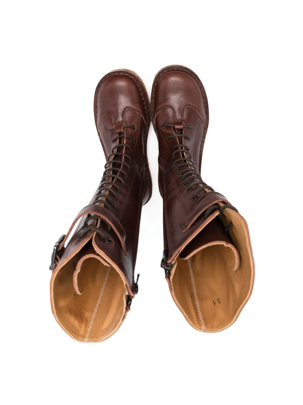 Коричневый, телячья кожа, гладкая текстура кожи, закругленный носок, шнуровка спереди, застежка на молнии сбоку, застежка на пряжке и ремешке, высота по колено и плоская резиновая подошва.