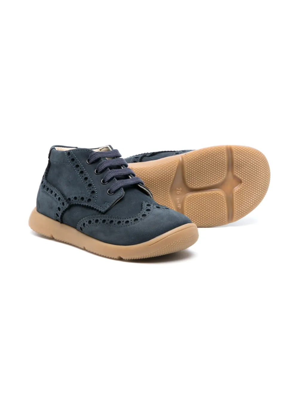 Темно-синий, бежевый, телячья кожа, замша из телячьей кожи, вставки в стиле вестерн, перфорация, декоративная строчка, стелька с логотипом, закругленный носок, шнуровка спереди, высота по щиколотку и плоская резиновая подошва.