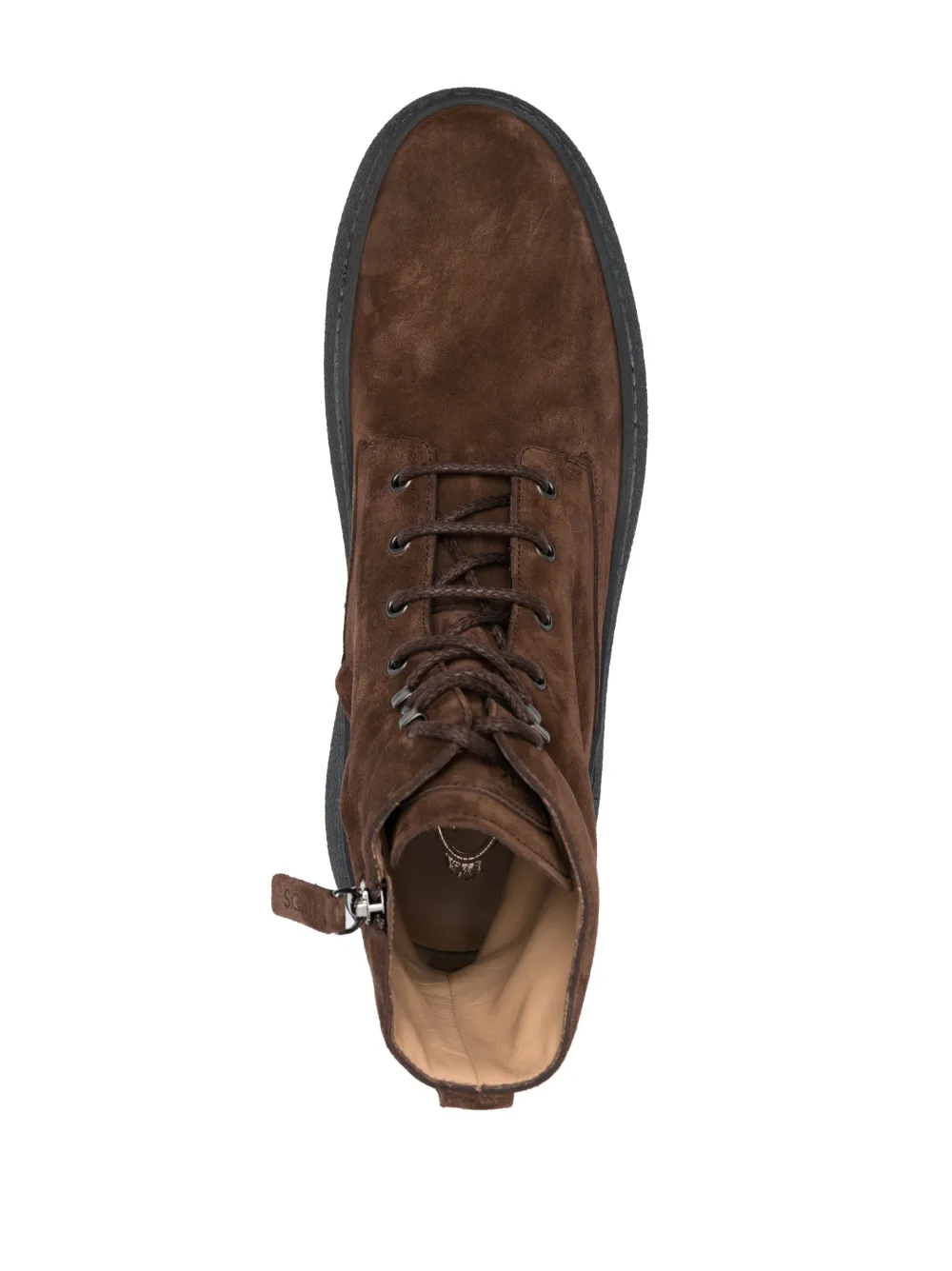 Шоколадный, замша из телячьей кожи, телячья кожа, нашивка с логотипом на язычке, логотип на подошве, закругленный носок, шнуровка спереди, стелька с логотипом, застежка на молнии сбоку и плоская резиновая подошва.