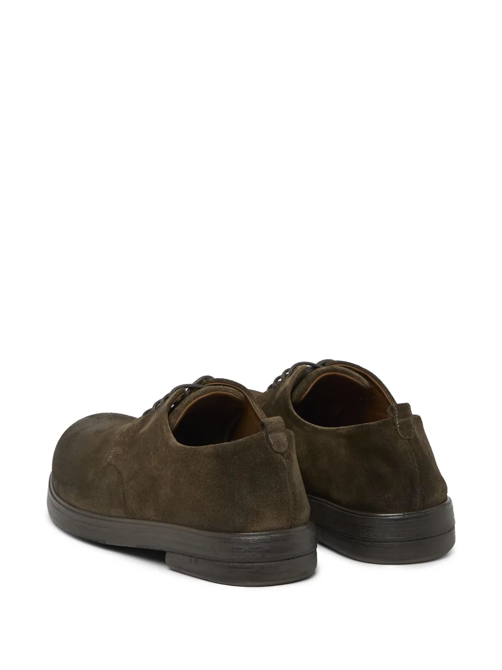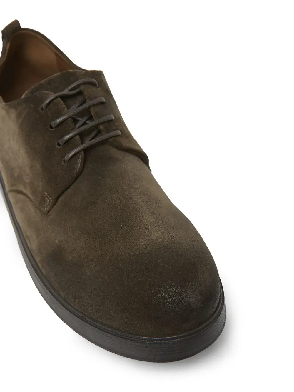 Кофейный, замша из телячьей кожи, шнуровка спереди, закругленный носок, плоская резиновая подошва и низкий блочный каблук.
