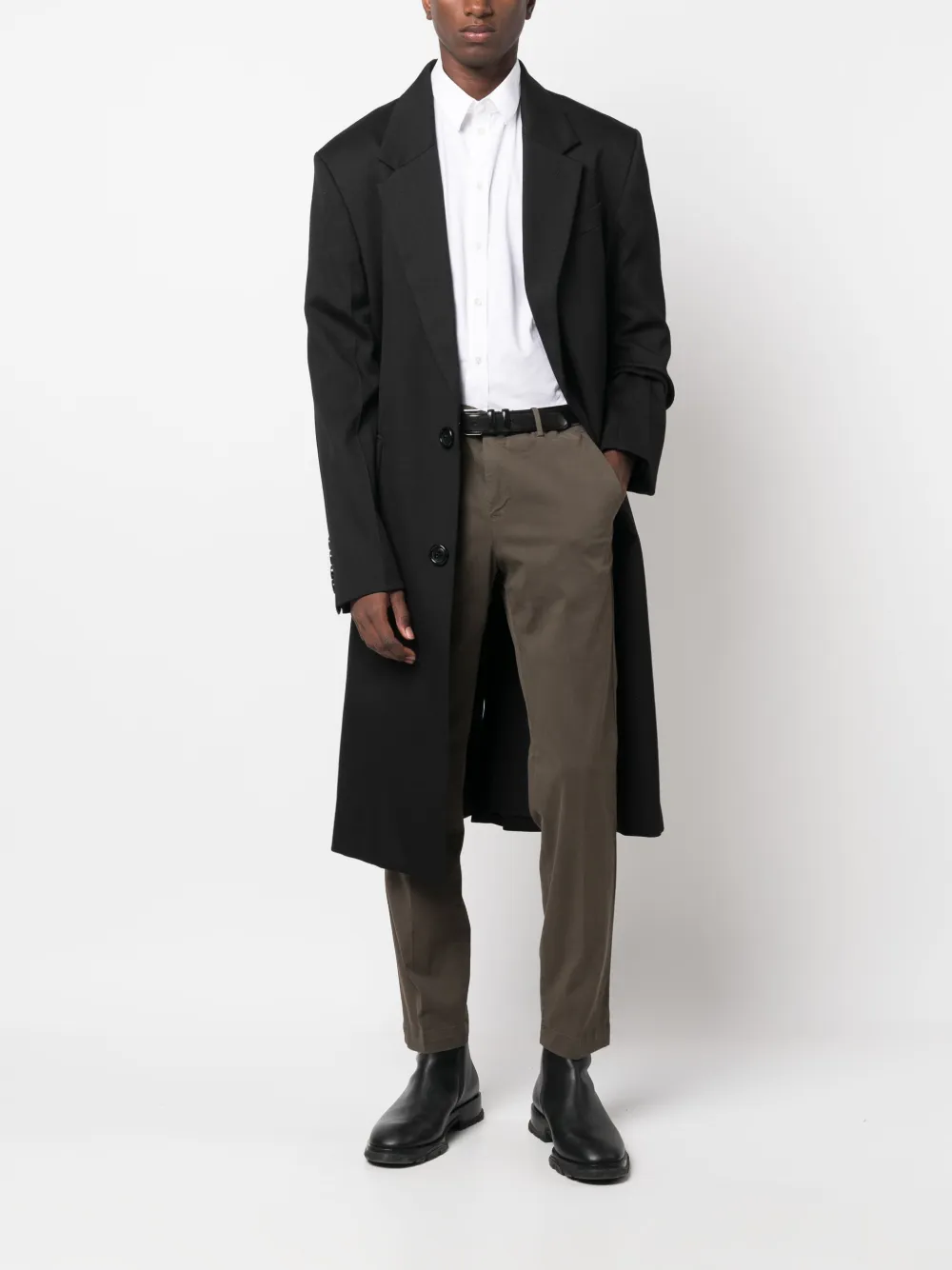 Коричневый, эластичный хлопок, классический крой, стрелки, петли для ремня, смещенная застежка спереди, прямой крой, два вшитых кармана по бокам и два кармана с клапанами сзади.