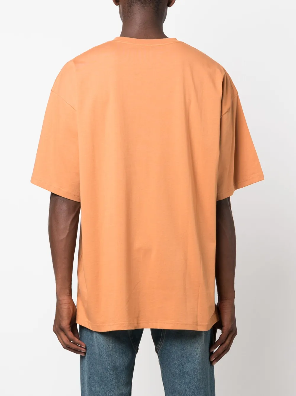 Оранжево-терракотовый, разноцветный, хлопок, графичный принт спереди, круглый вырез, короткие рукава и прямой подол.