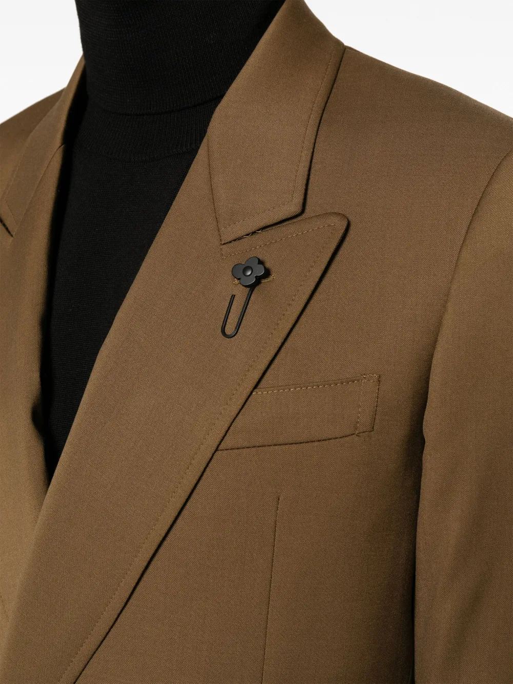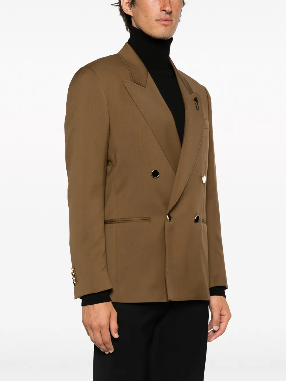 Декоративная брошь, эмалированные пуговицы, заостренные лацканы, двубортная застежка на кнопки, манжеты на пуговицах, два прорезных кармана спереди и цельная подкладка.