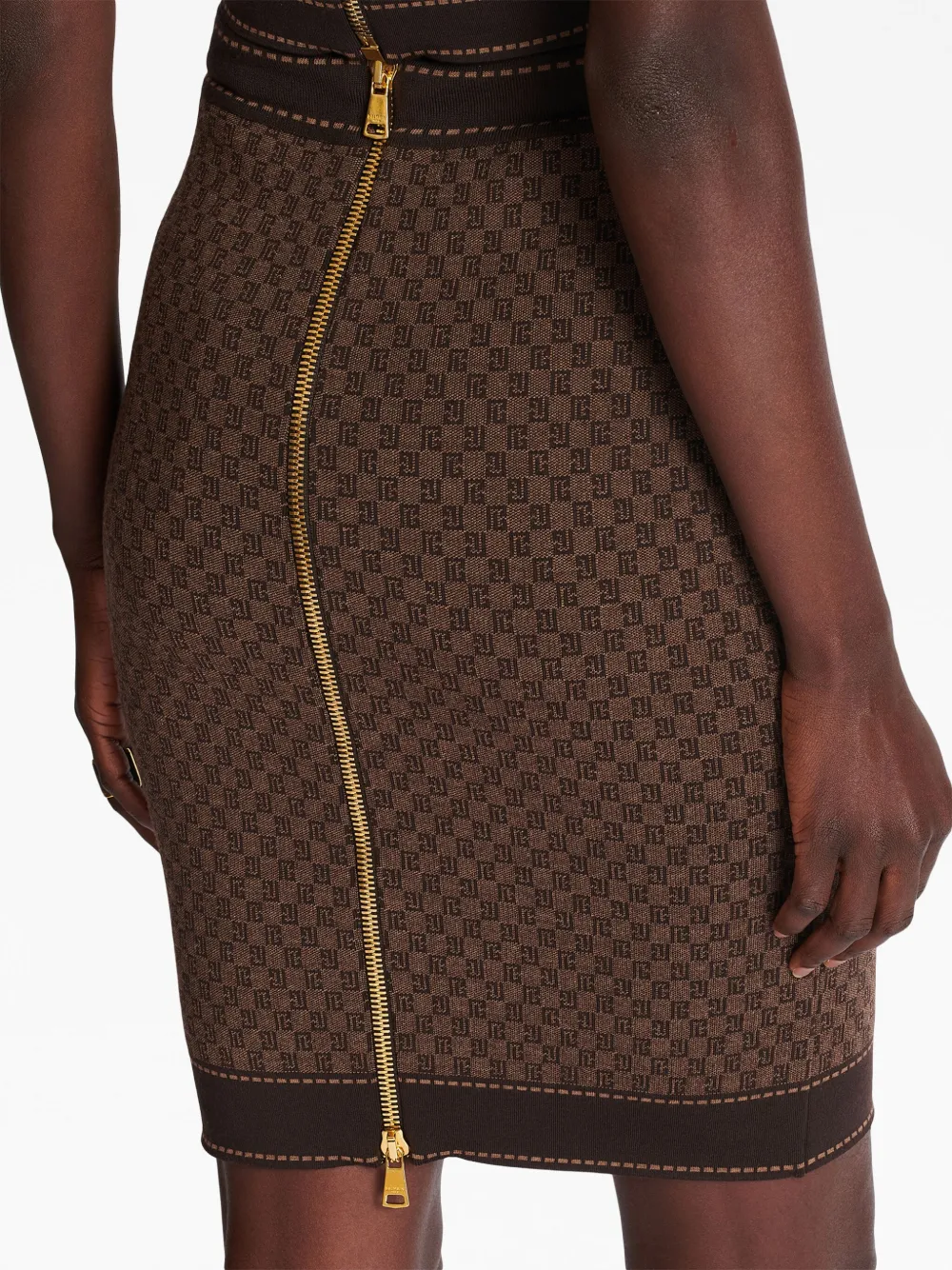 Коричневый, бежевый, смесовая шерсть мериноса, жаккард с монограммой, застежка на молнии сзади и длина выше колена.