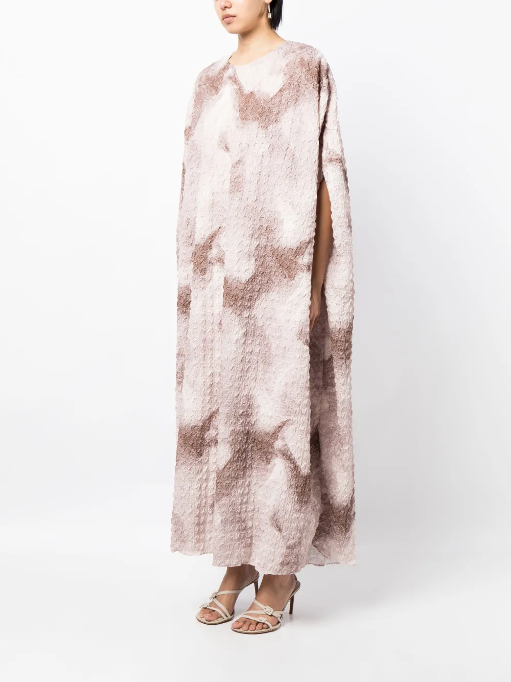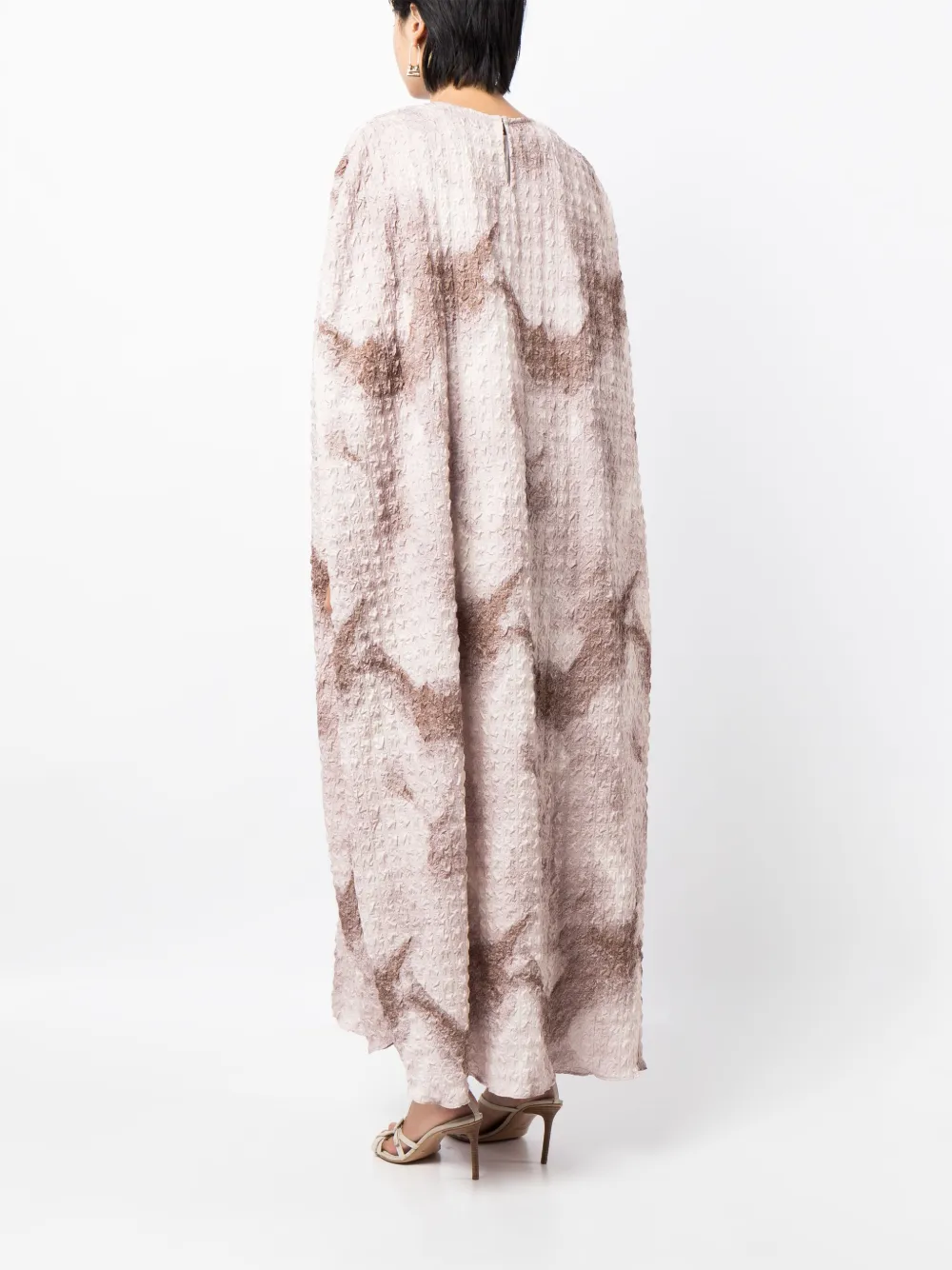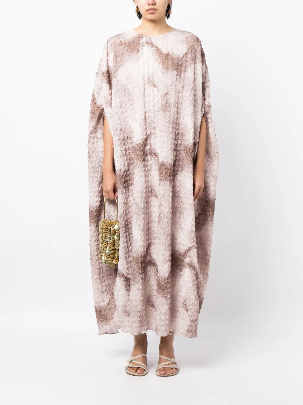 Коричневый, жаккард, абстрактный принт, круглый вырез, драпировка, короткие рукава и длинная модель.