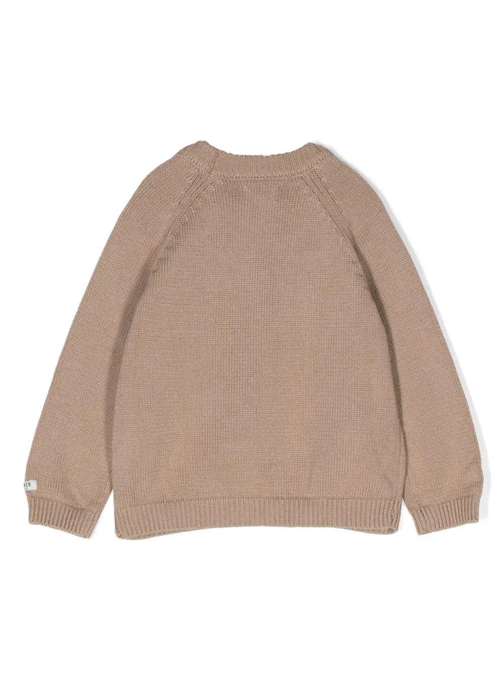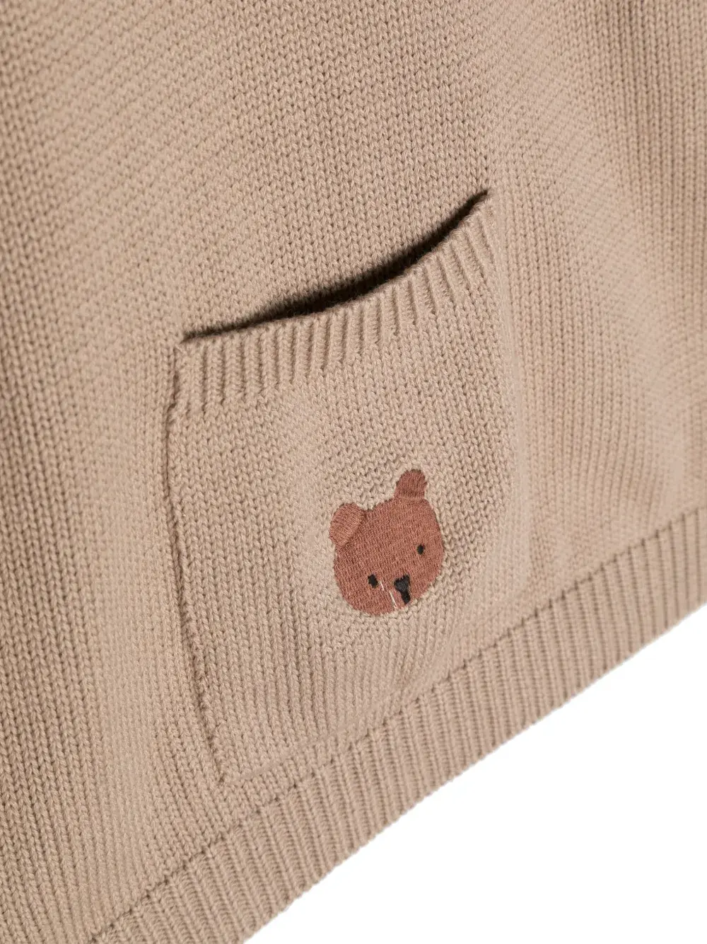 Бежевый, хлопок, трикотажный материал, тонкая вязка, изображение медведя, бирка с логотипом, круглый вырез, накладной карман спереди, длинные рукава и прямой подол.