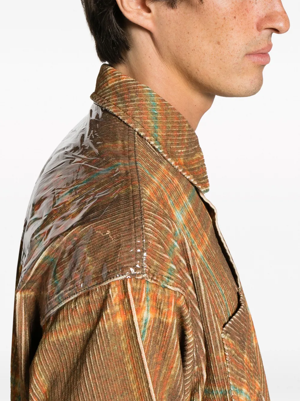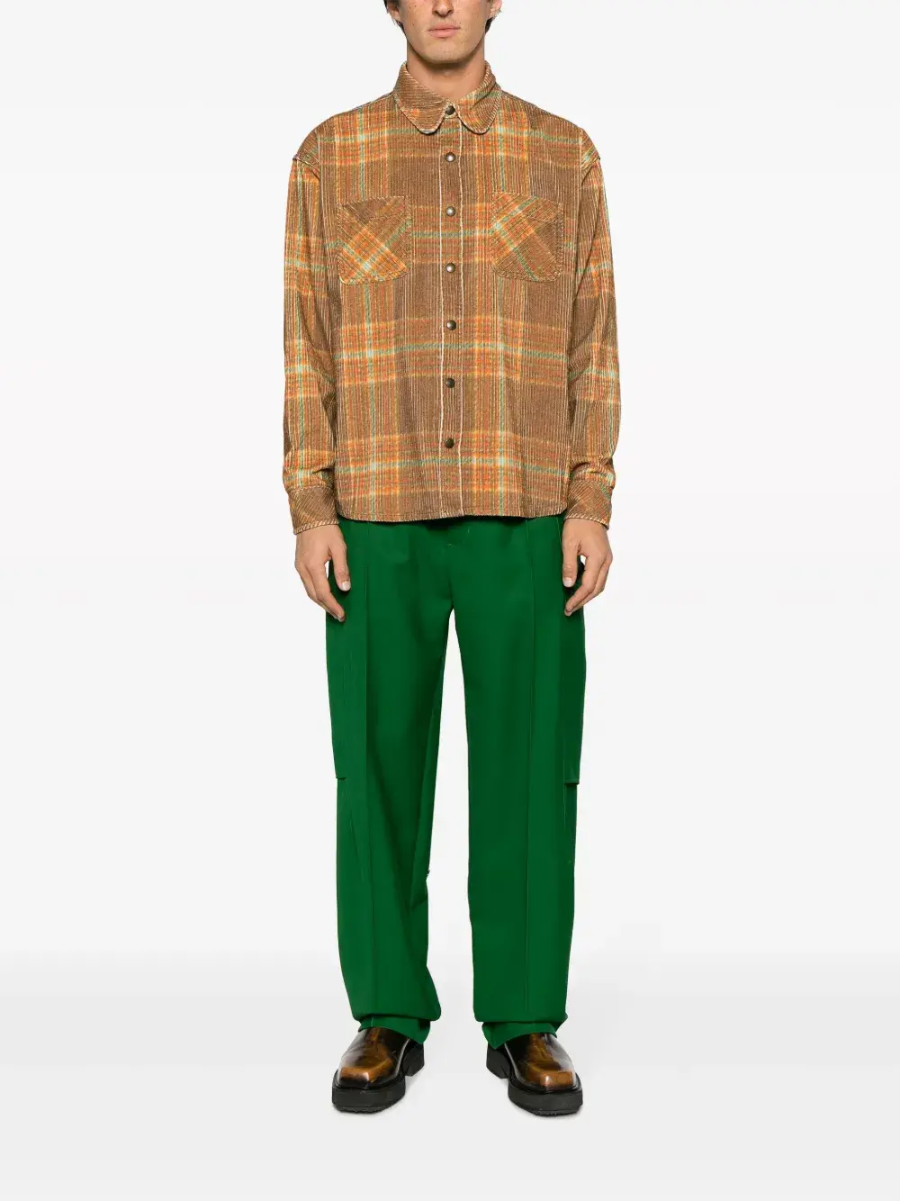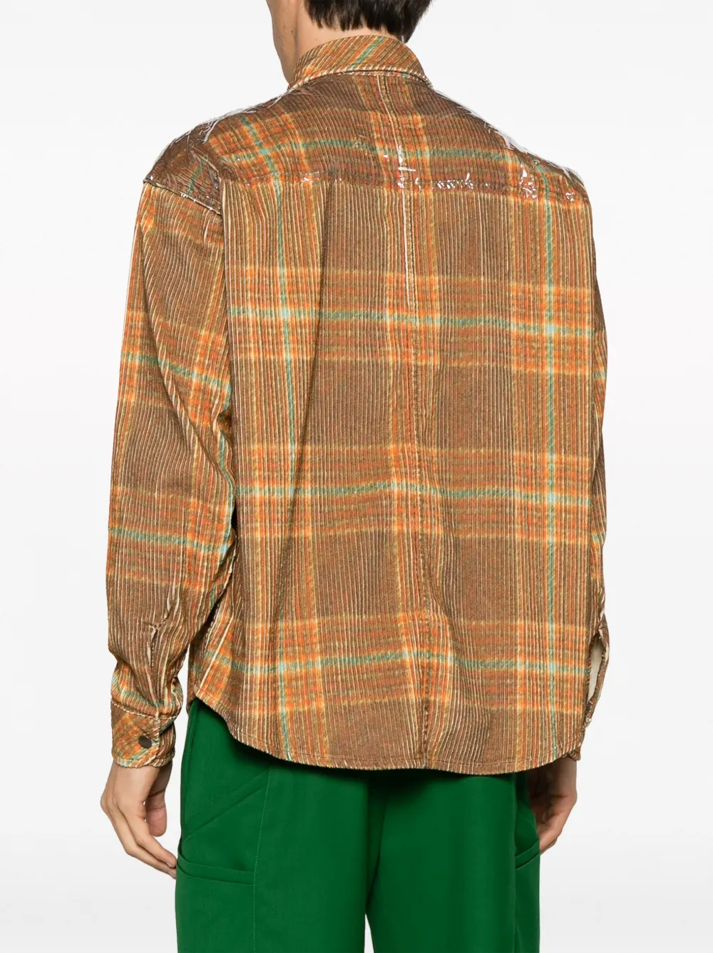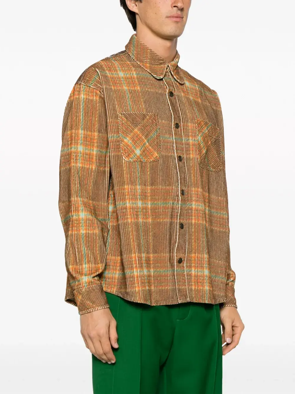 Коричневый, хлопок, принт в клетку, длинные рукава, классический воротник, два накладных кармана на груди, манжеты на пуговицах, застежка на пуговицах спереди и закругленный подол.