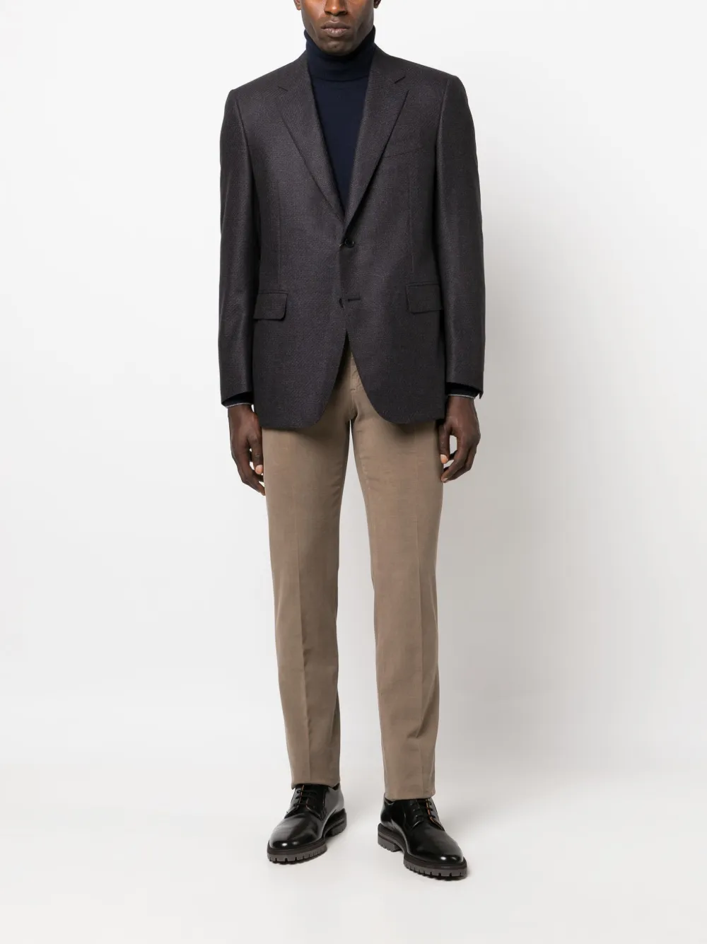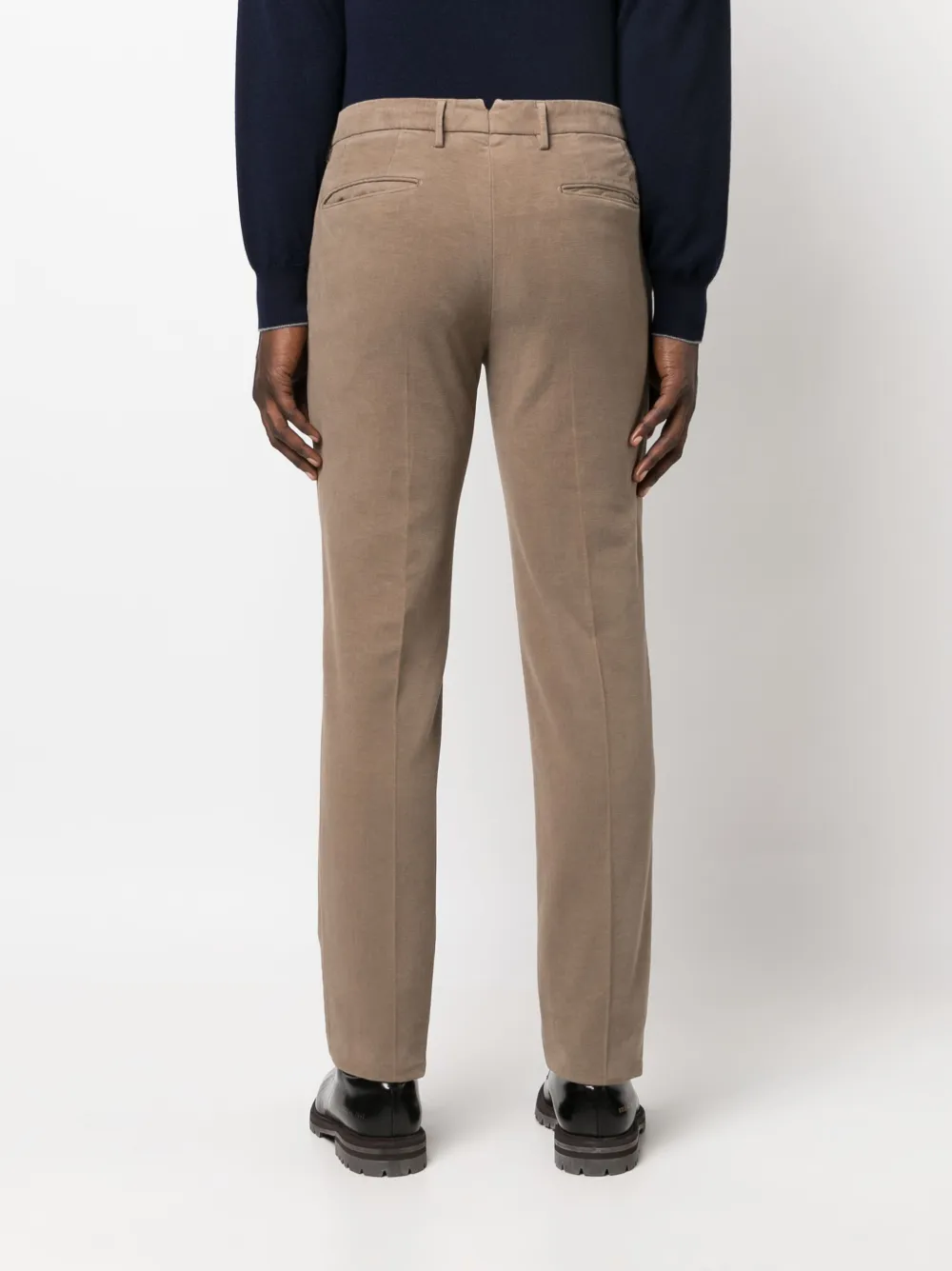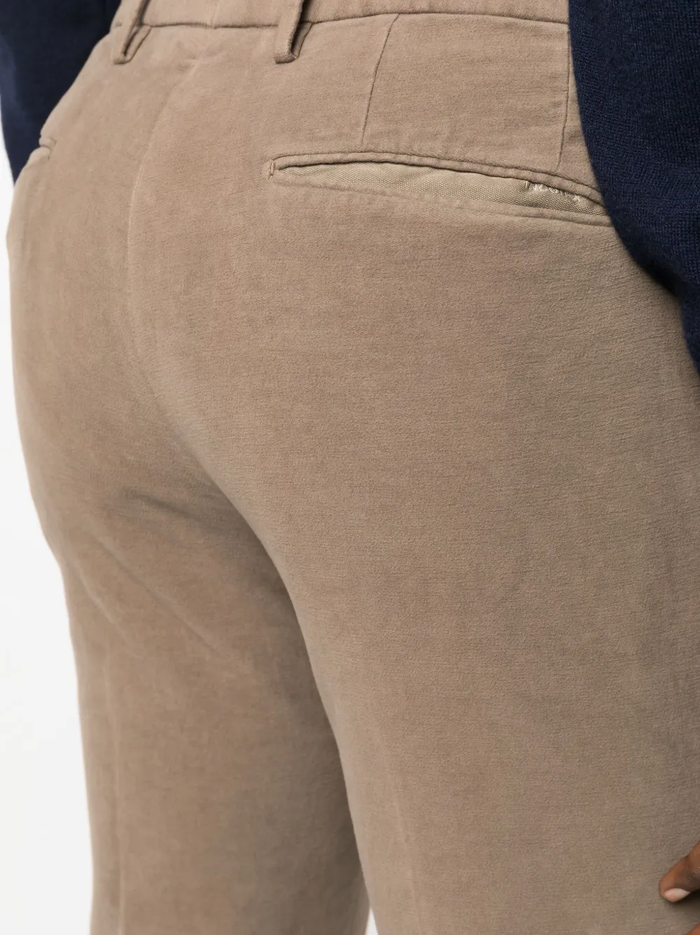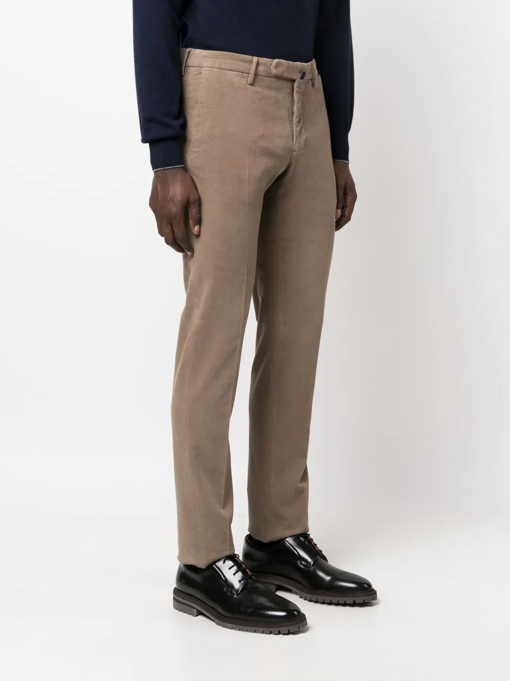 Расцветка Light Brown, эластичный хлопок, узкий крой, средняя посадка, потайная застежка спереди, петли для ремня, два прорезных кармана по бокам, два кармана с листочкой сзади и стрелки.