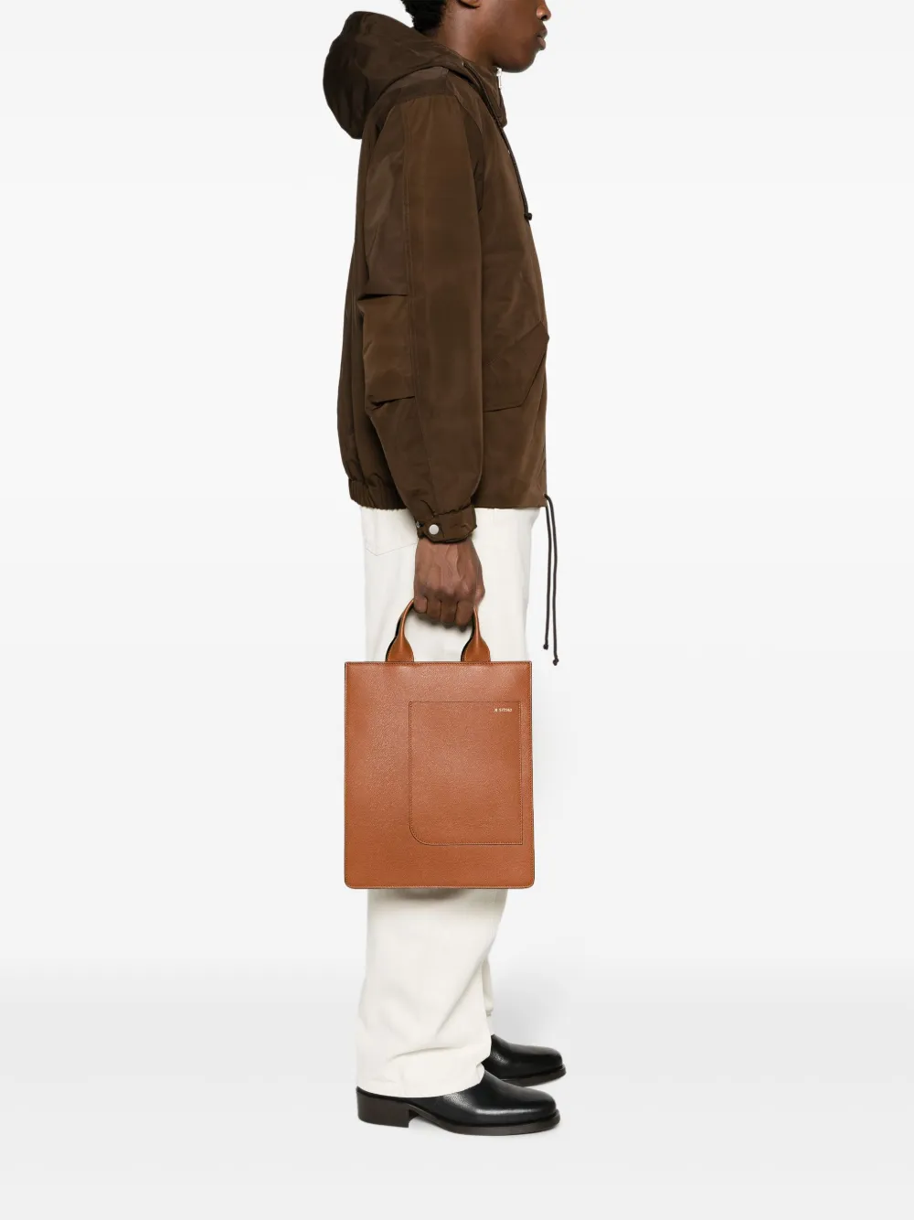 Шоколадный, телячья кожа, зернистая текстура, дизайн с открытым верхом, две верхние ручки, съемный ремень на плечо, накладной карман спереди, тисненый логотип внутри, внутренние прорезные карманы, основное отделение и серебристая фурнитура. В комплект входит мешок-пыльник для хранения.