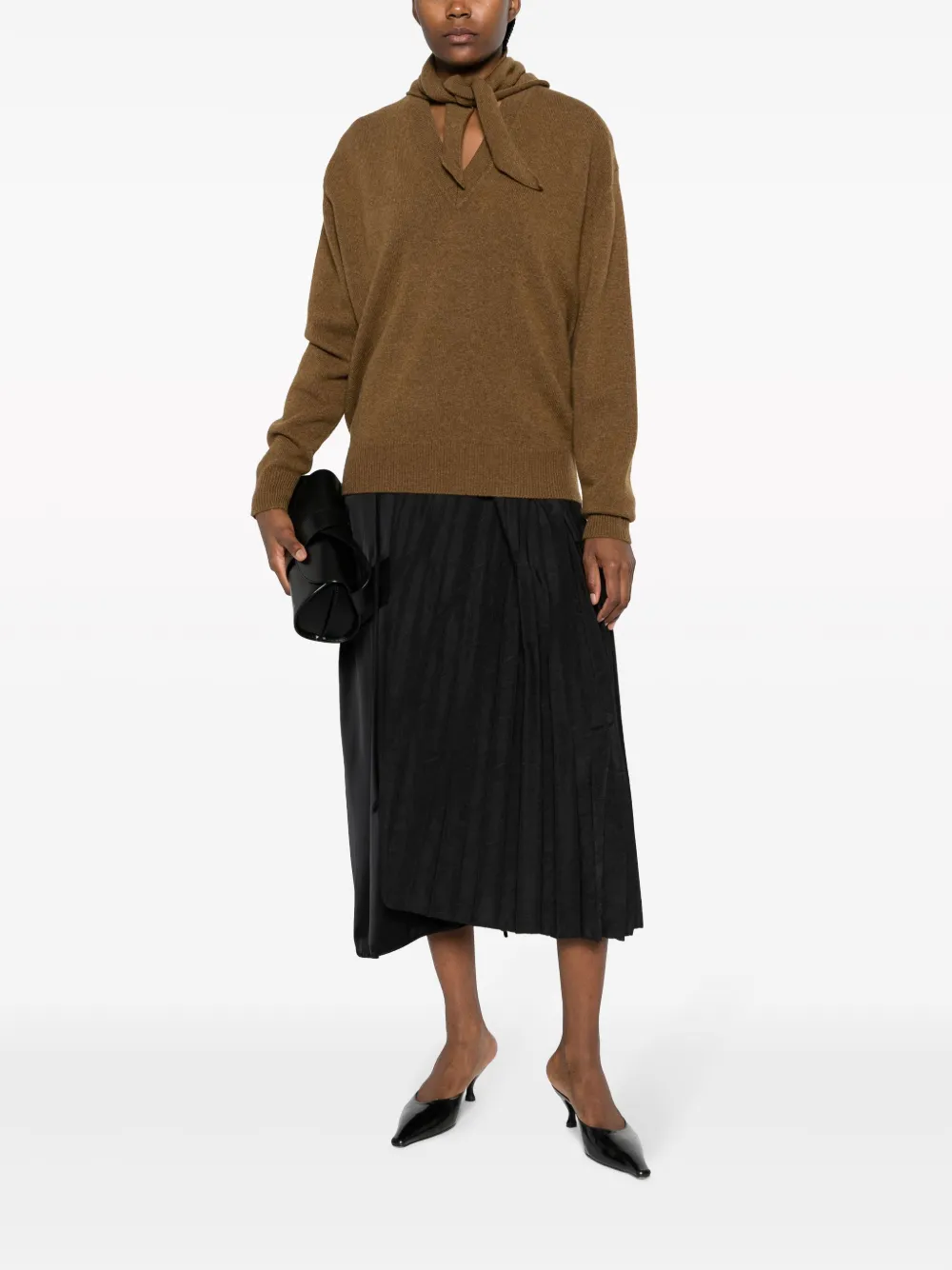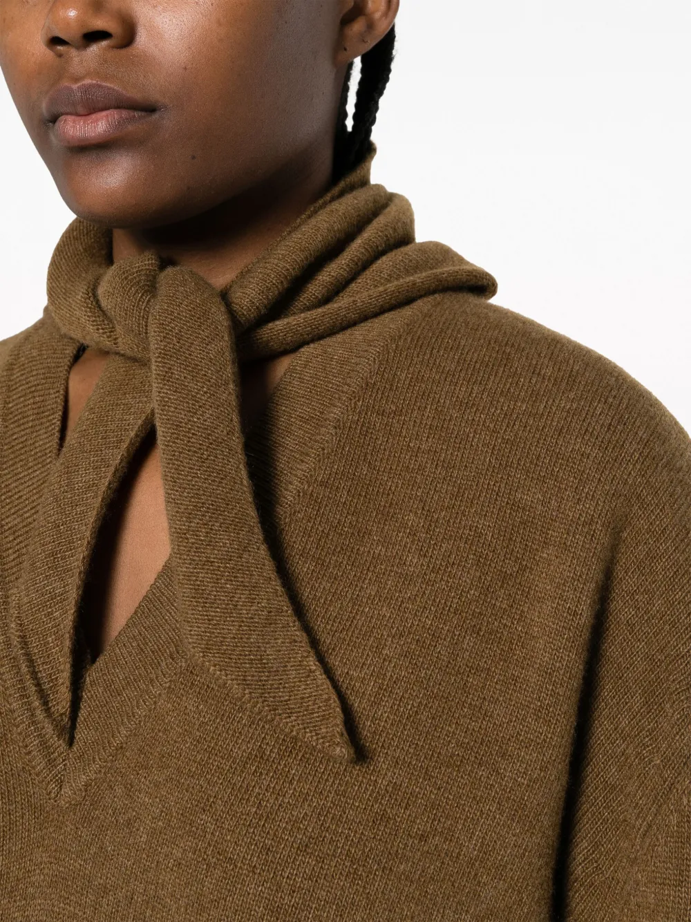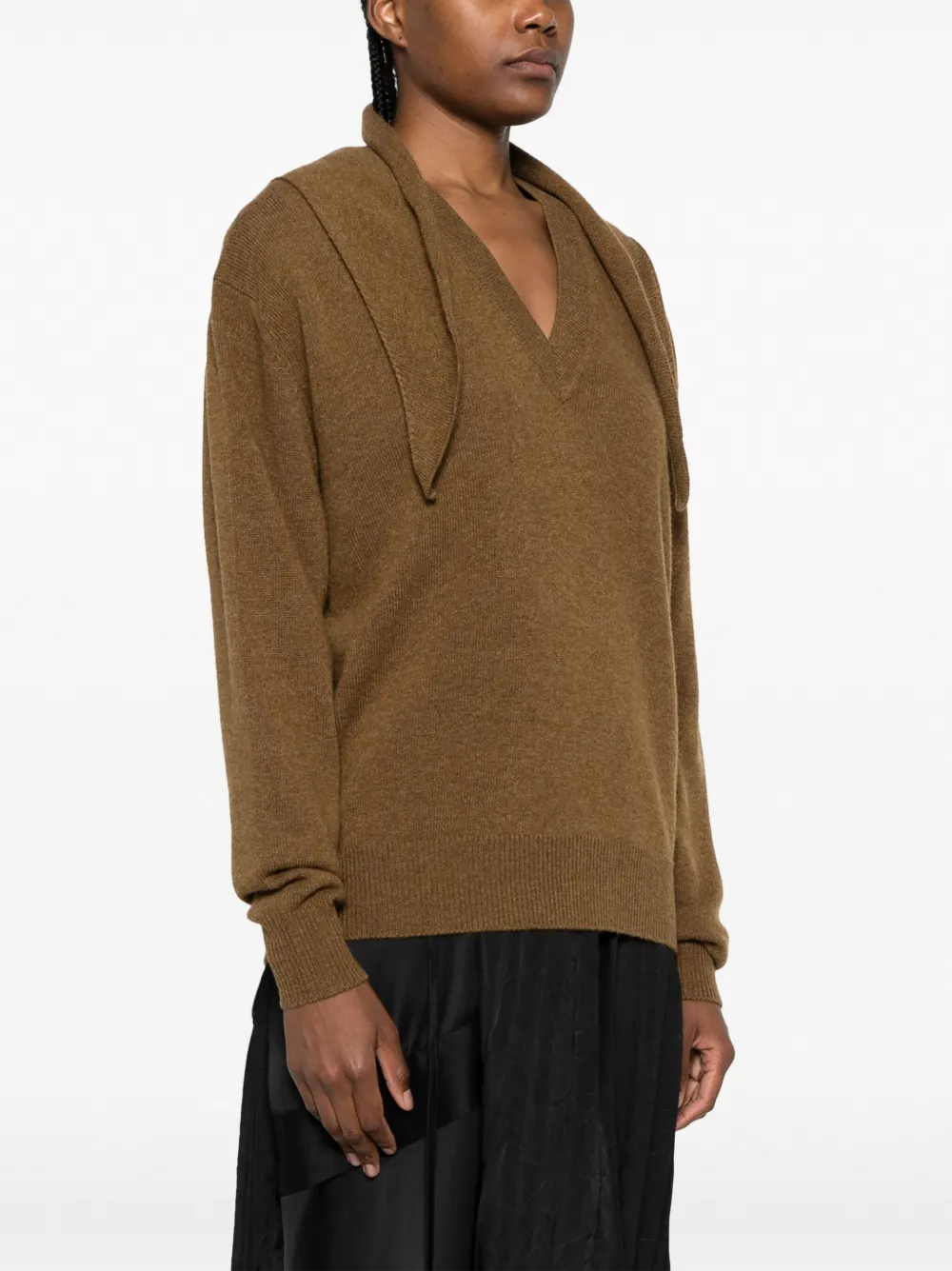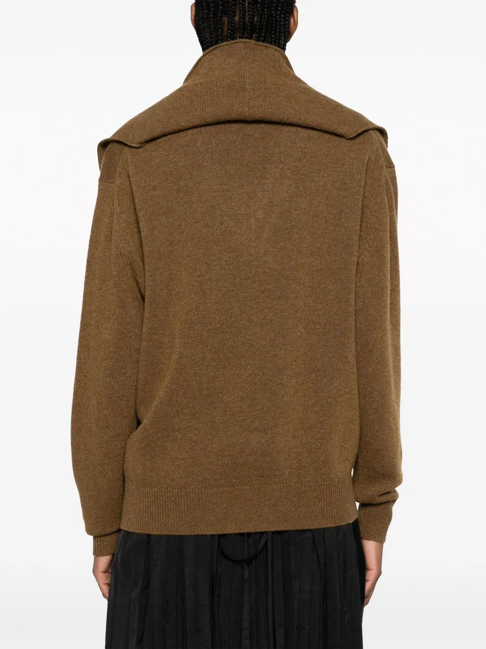 Каштановый, смесь шерсти и кашемира, трикотаж в рубчик, несъемный шарф, приспущенные плечи, длинные рукава и прямой подол.