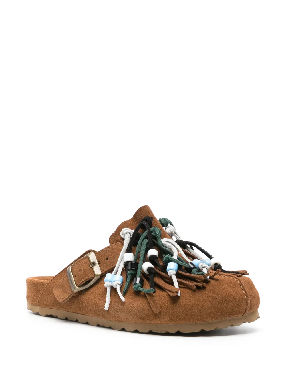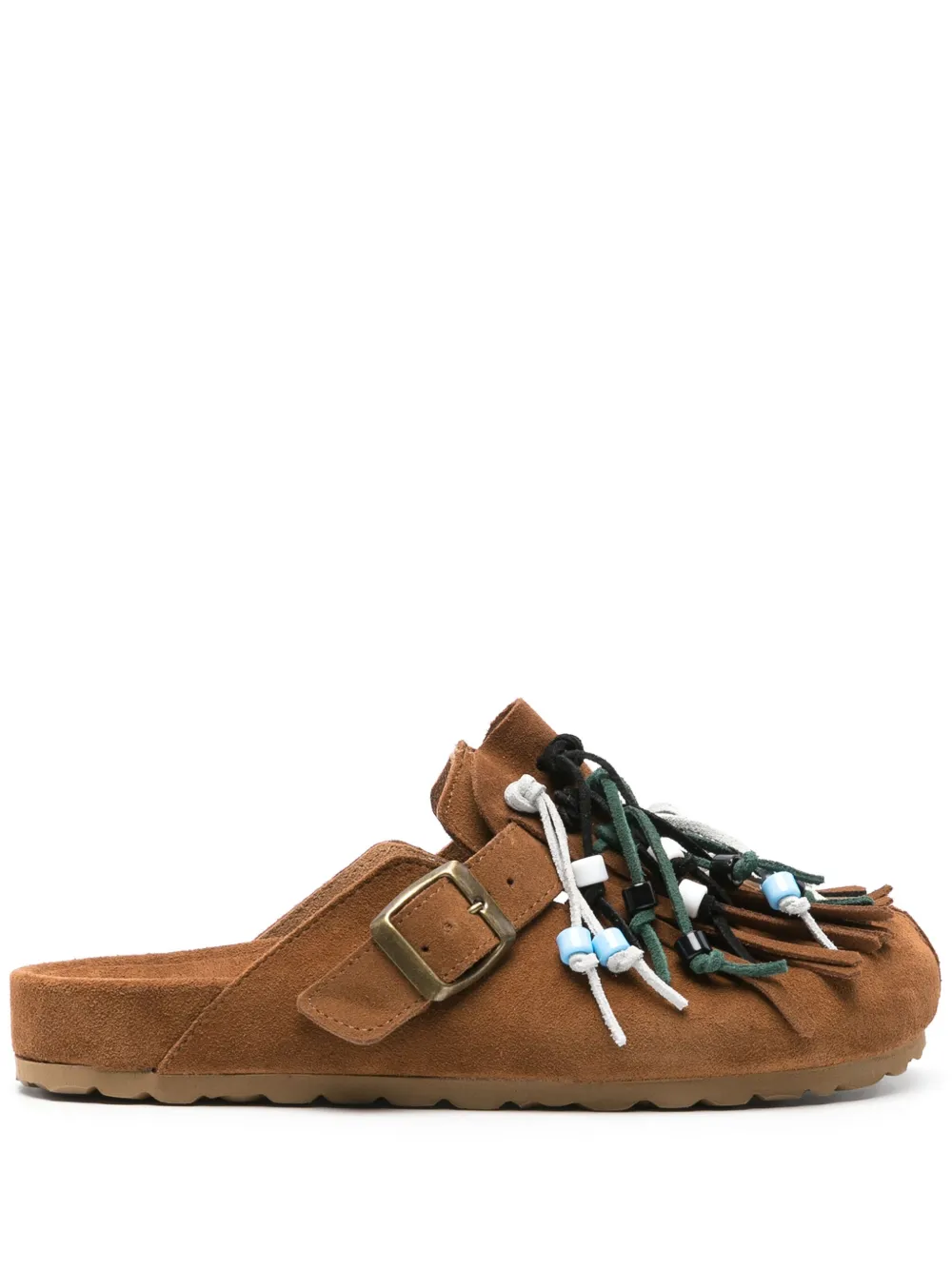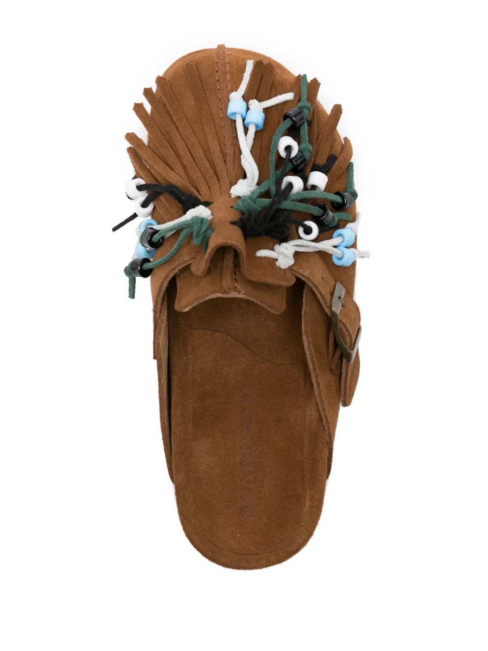 Коричневый, замша из телячьей кожи, декоративные кисточки, детали из бисера, закругленный носок, боковые застежки с пряжками, модель без застежки, кожаная стелька с логотипом и плоская резиновая подошва.