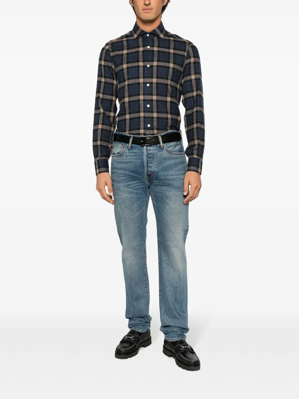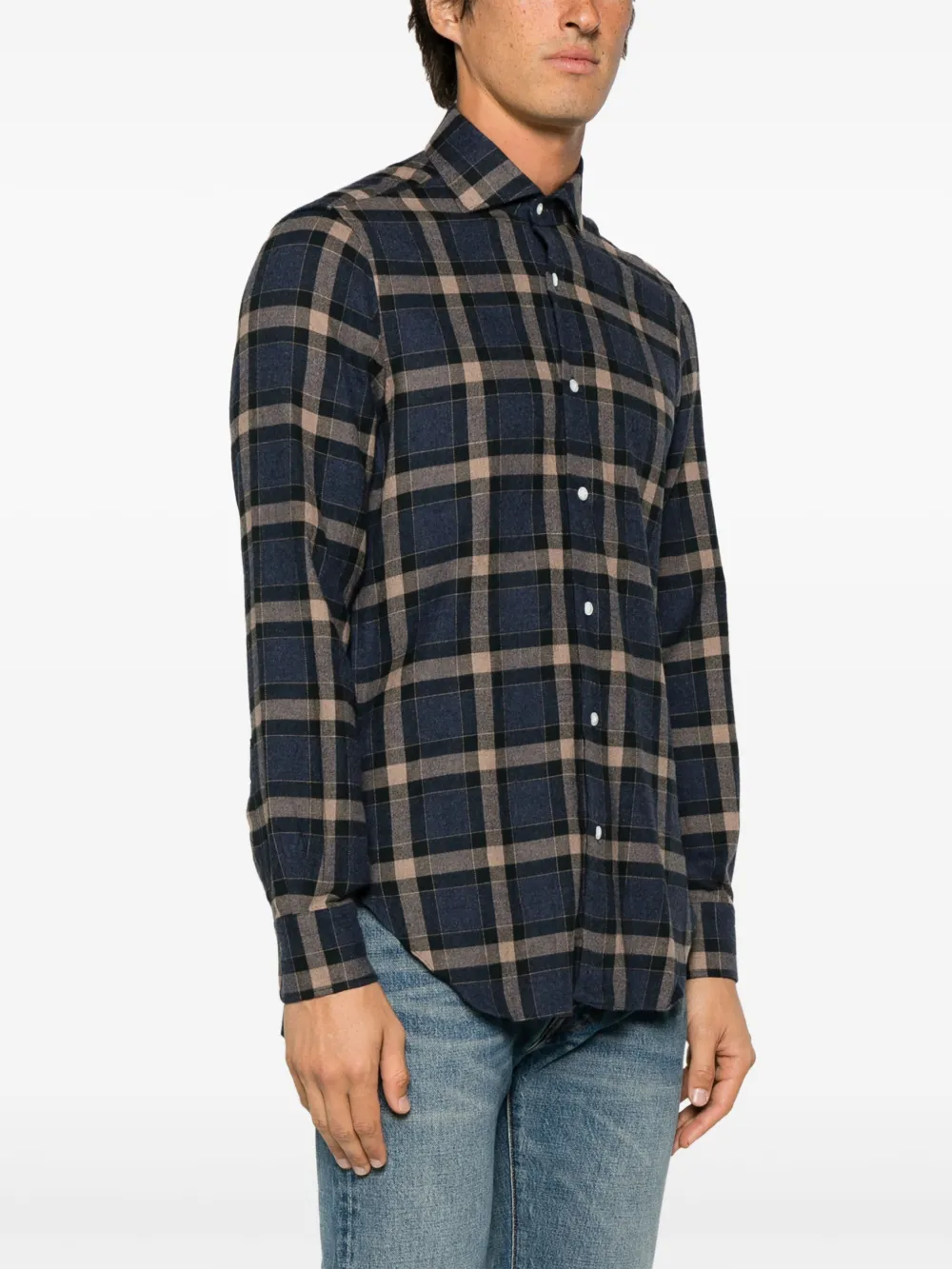 Темно-синий, коричневый, хлопок, клетчатый узор, классический воротник, застежка на пуговицах спереди, длинные рукава, манжеты на пуговицах и закругленный подол.