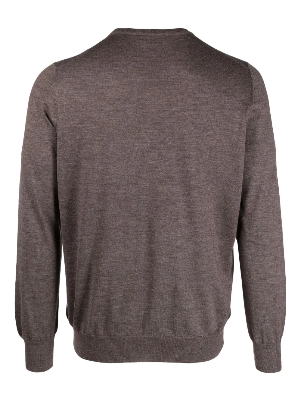 Серо-коричневый, смесь кашемира и шелка, тонкая вязка, вязаные края в рубчик, эффект меланж, круглый вырез, длинные рукава и прямой подол.