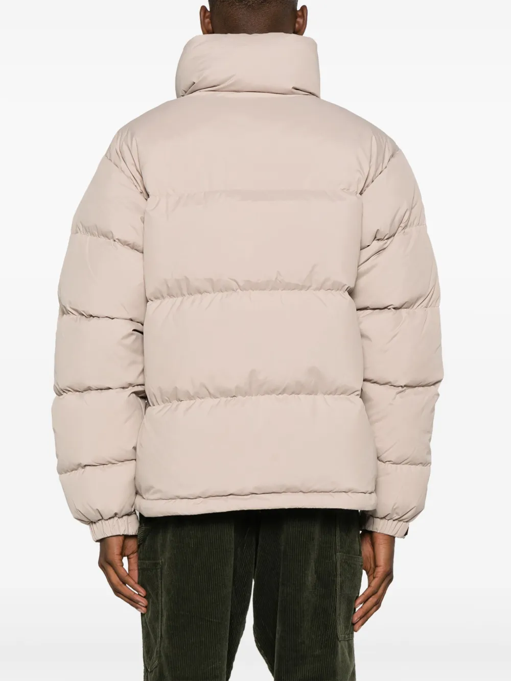 Бежевый, наполнитель из смеси пуха и пера, принт с логотипом на груди, дутый материал, высокий воротник, двусторонняя молния спереди, два кармана на молнии по бокам, длинные рукава, манжеты на липучках и прямой подол. .