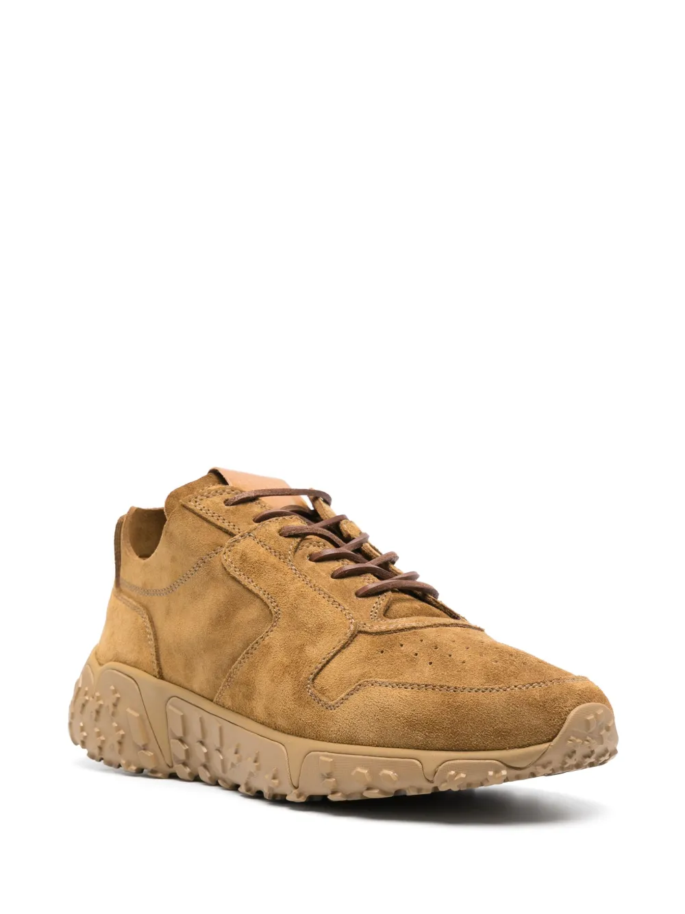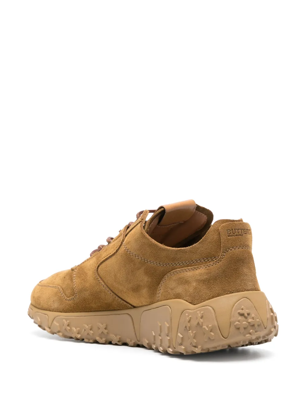 Карамельный, телячья кожа, замша из телячьей кожи, тисненый логотип сзади, нашивка с логотипом на язычке, перфорация, закругленный носок, шнуровка спереди, кожаная стелька с логотипом и массивная резиновая подошва.