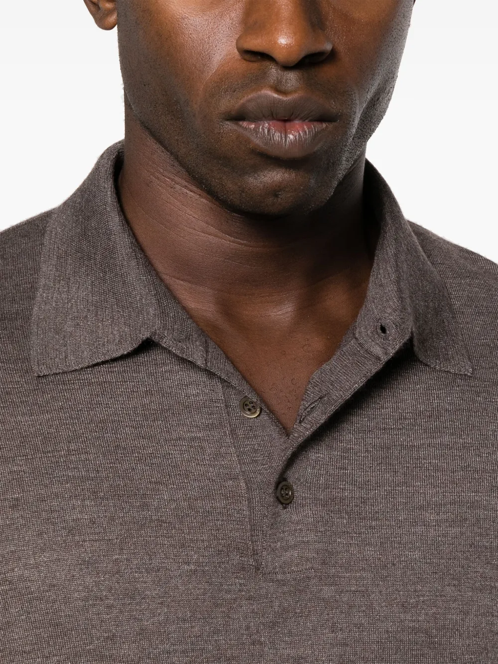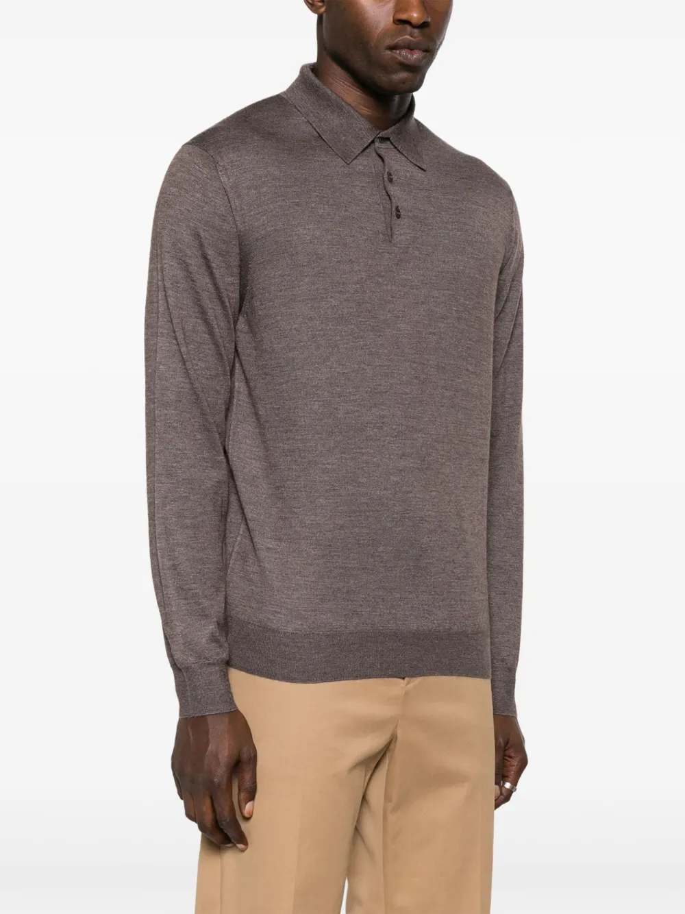 Серо-коричневый, смесь кашемира и шелка, тонкая вязка, воротник поло, планка на пуговицах спереди и длинные рукава.