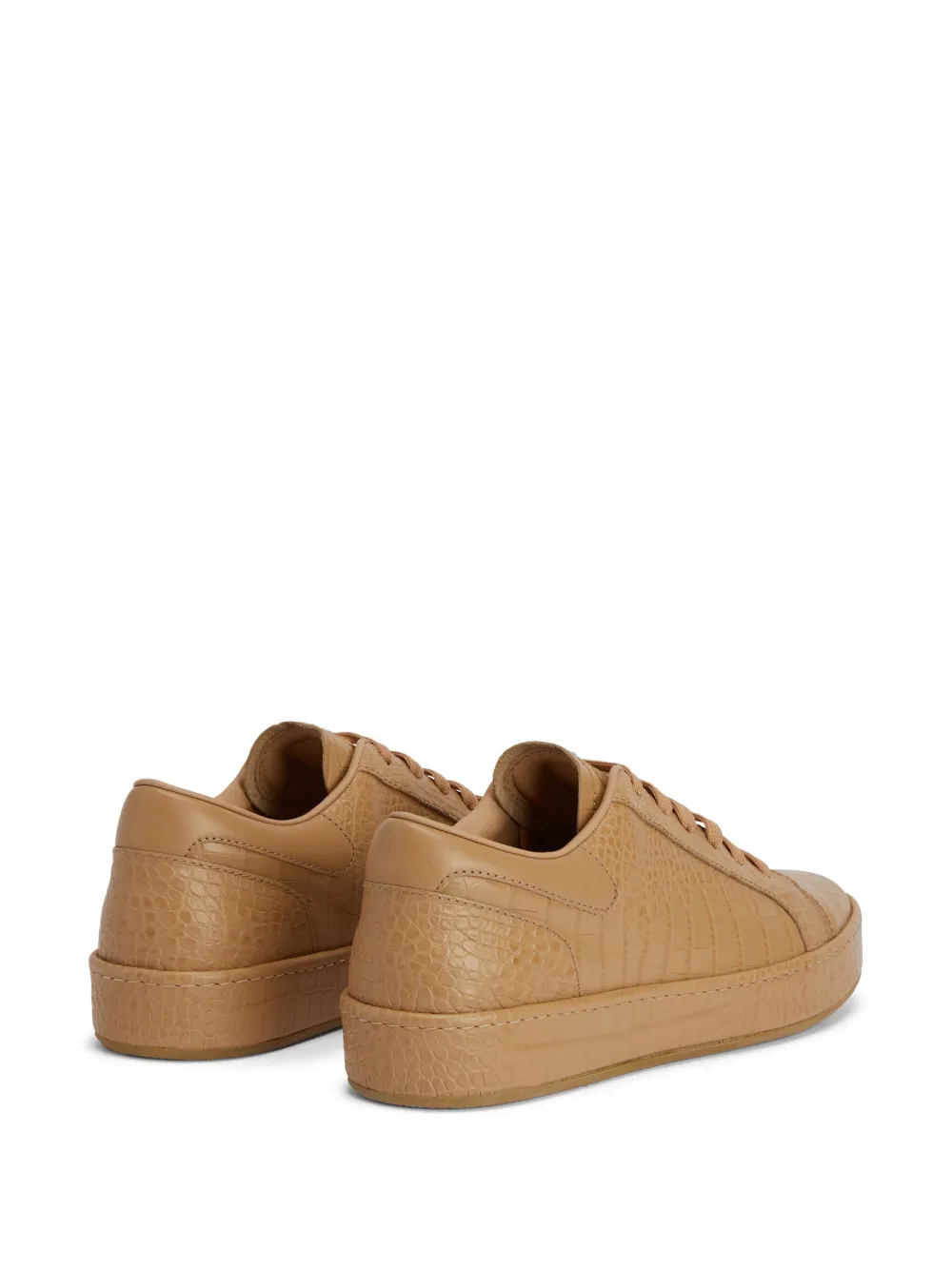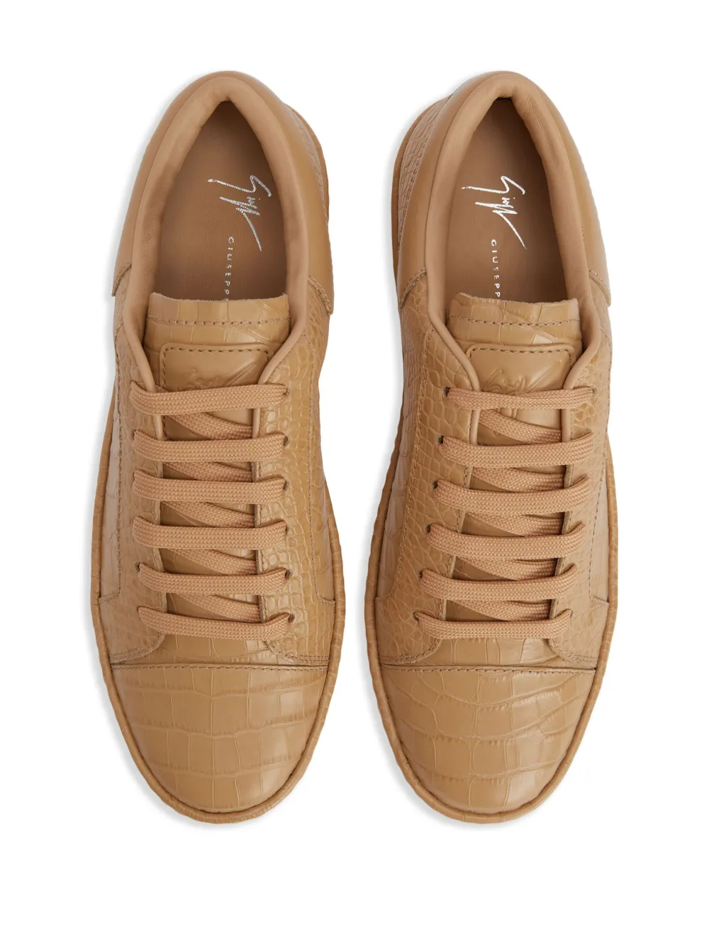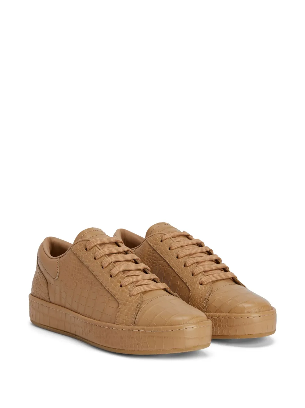 Бежевый, кожа, тиснение под кожу крокодила, нашивка с логотипом на язычке, шнуровка спереди, закругленный носок, стелька с логотипом и плоская резиновая подошва.