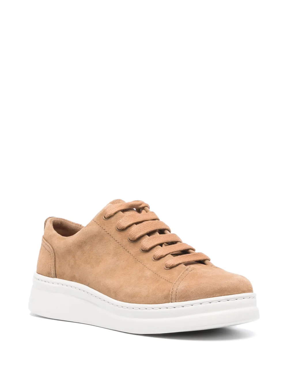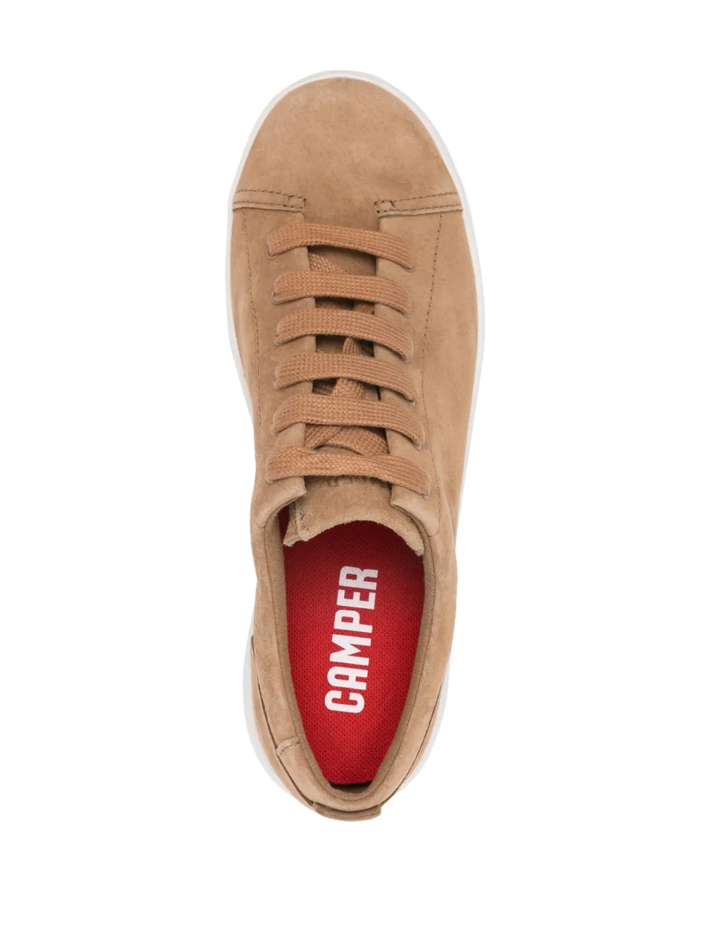 Бежево-коричневый, замша из телячьей кожи, логотип-аппликация, закругленный носок, шнуровка спереди, кожаная стелька с логотипом и массивная подошва.