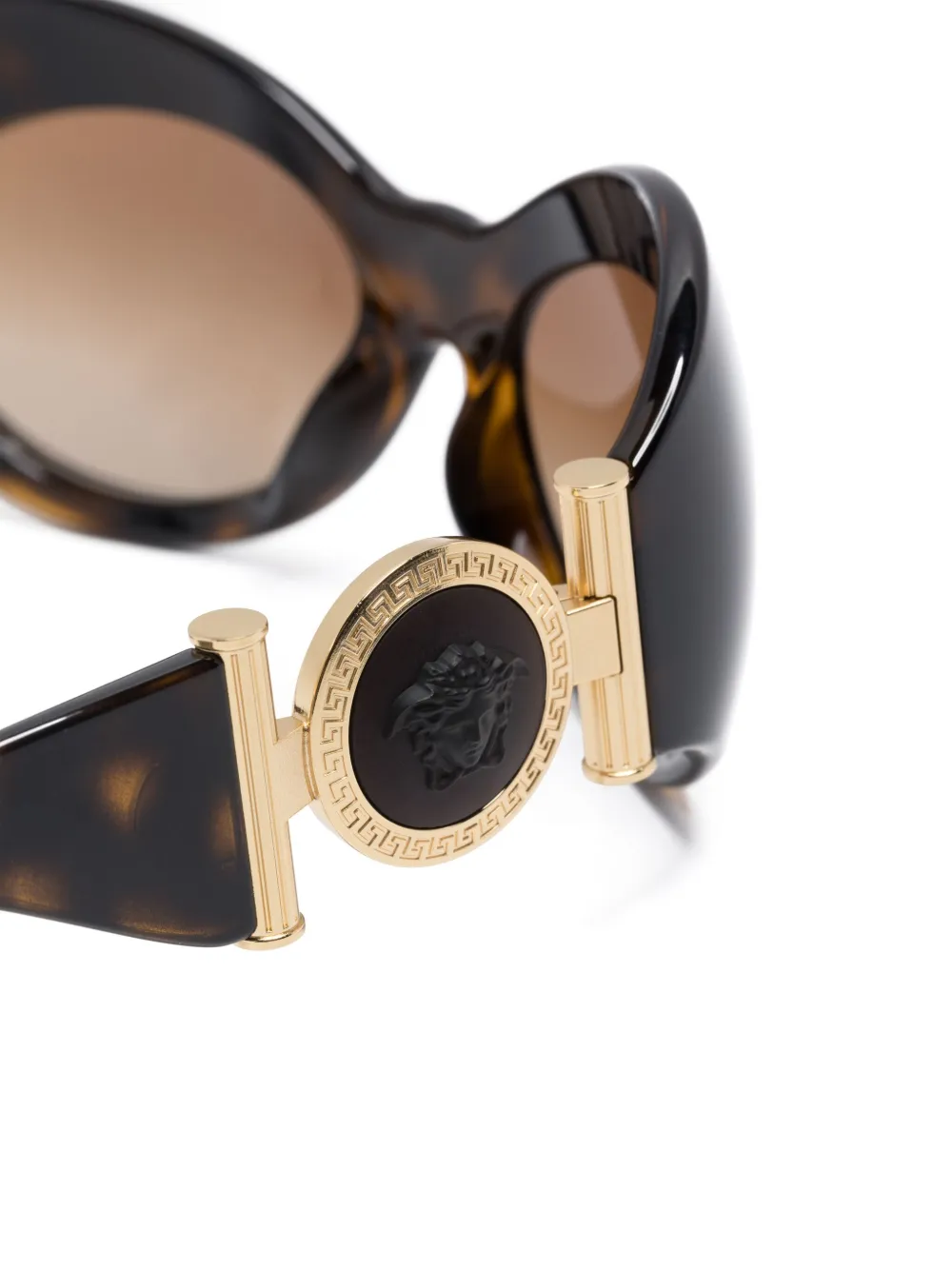 Черепаховая расцветка, оправа с боковой защитой, коричневые линзы, линзы с защитой от ультрафиолета, декор Medusa и знаковый орнамент Greca. В комплект входит защитный чехол для очков.