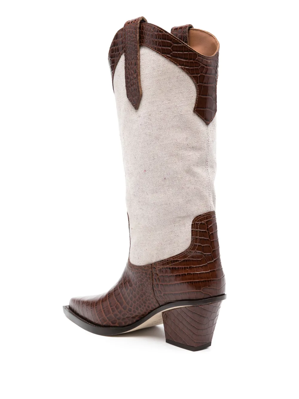 Подробнее о товаре: • шоколадно-коричневый/экрю • канвас • дизайн со вставками • вставки из телячьей кожи • тиснение под кожу крокодила • модель в стиле вестерн • сочетание двух оттенков • заостренный носок • длина до середины икры • двойная петля для подтягивания • кожаная стелька с логотипом • блочный каблук 60 мм • кожаная подошва • без застежки • В комплект входит мешок-пыльник для хранения.