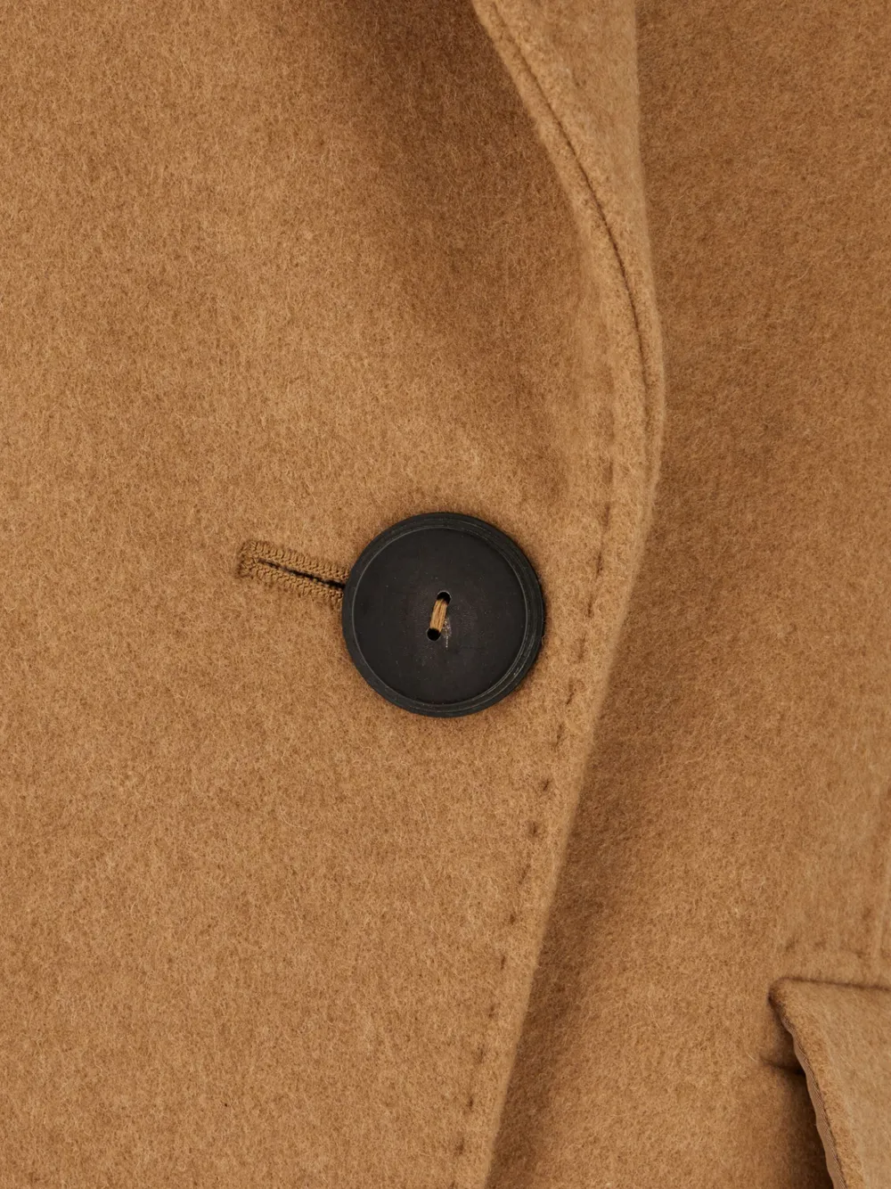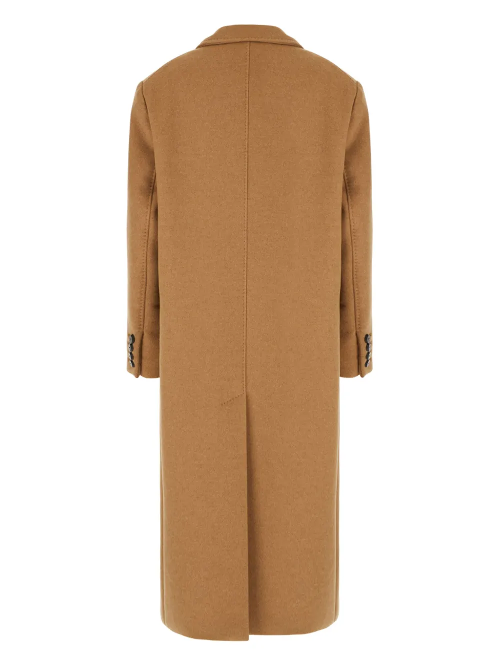 Подробнее о товаре: • бежево-коричневый • смесовый кашемир • эффект войлока • двубортная застежка на пуговицы • широкие заостренные лацканы • вышитый логотип на лацкане • подплечники • длинные рукава • манжеты с декоративными пуговицами • защипы • два кармана с клапанами по бокам • шлица по центру сзади • внутренний накладной карман • цельная подкладка • прямой подол • длина до середины икры