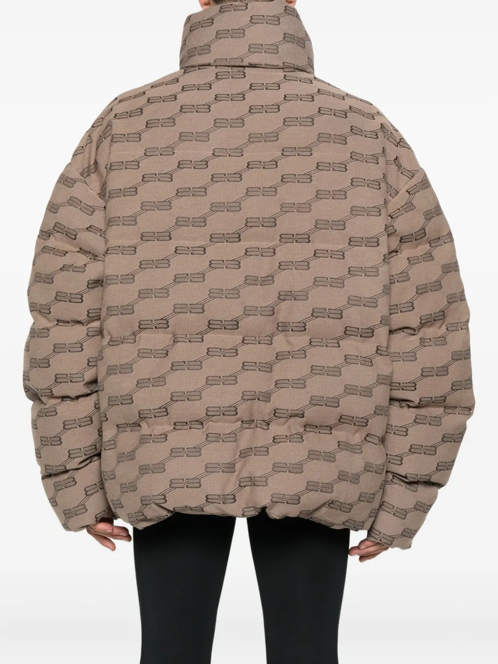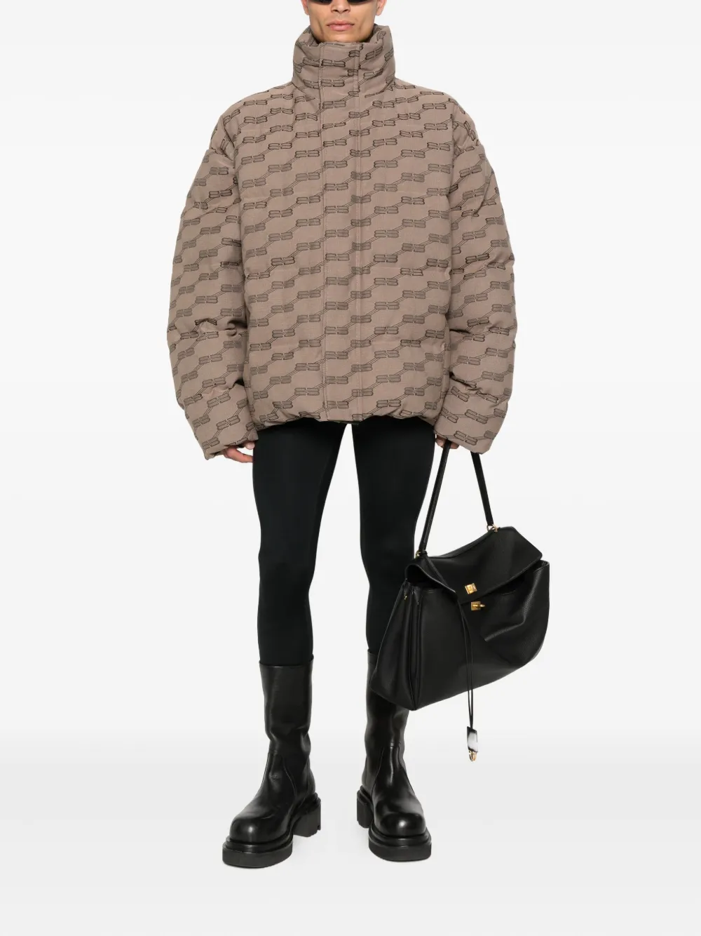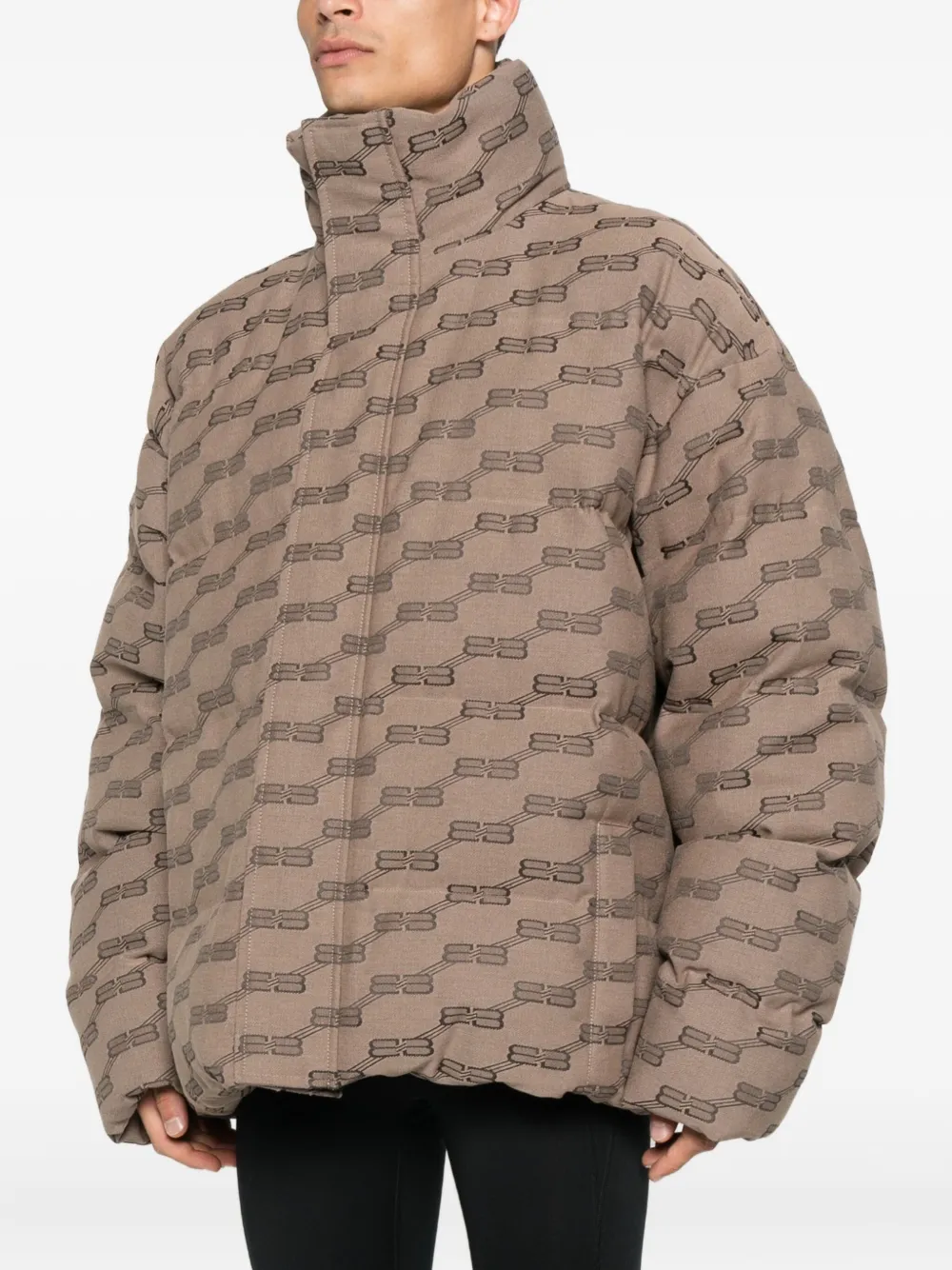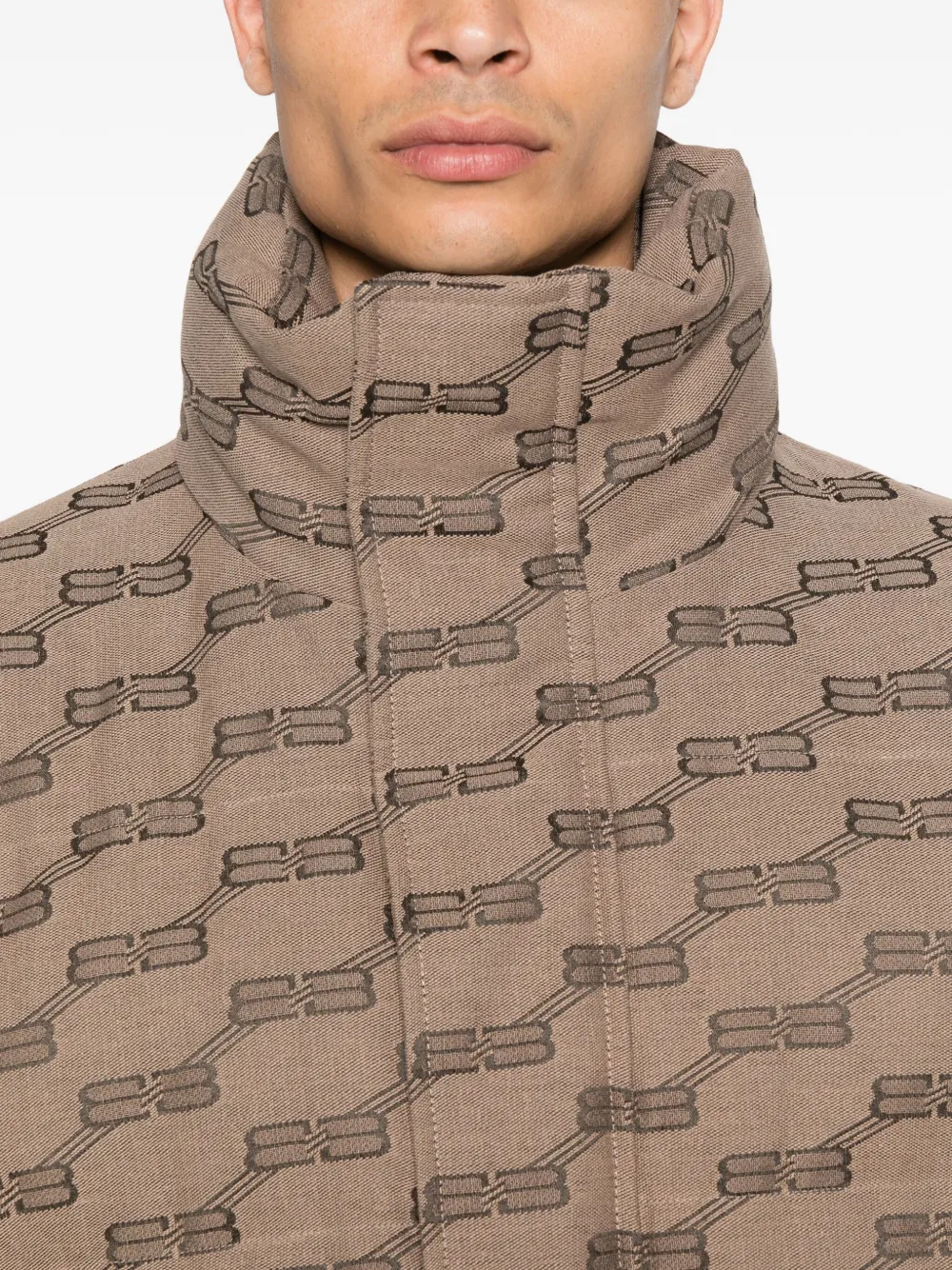 Коричневый стеганый дизайн, высокий ворот, узор с логотипом по всей поверхности, длинные рукава, застежка-молния