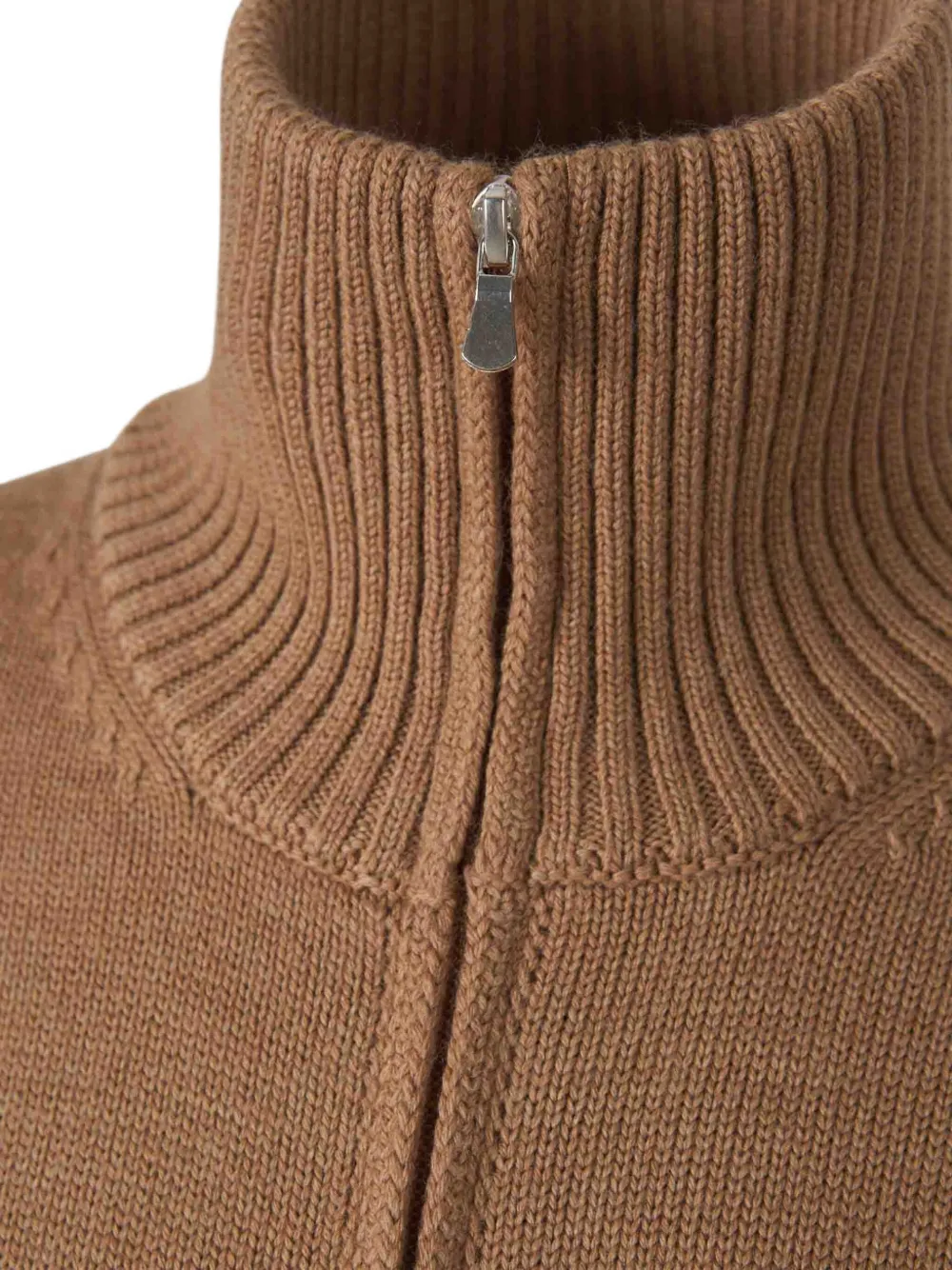 Верблюжье-коричневого цвета, застежка-молния с двумя бегунками спереди, два прорезных кармана по бокам, ребристая отделка, высокий воротник