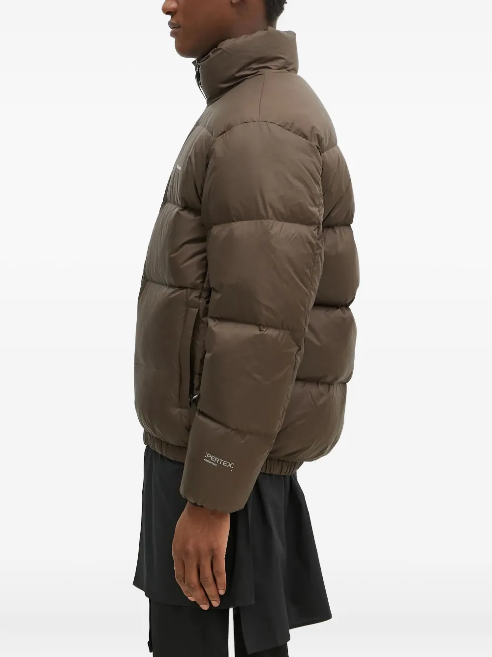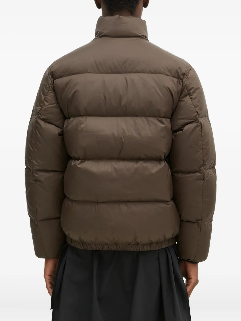 Коричневый утепленный дизайн, высокий ворот, застежка-молния спереди, боковые карманы на молнии, эластичный подол