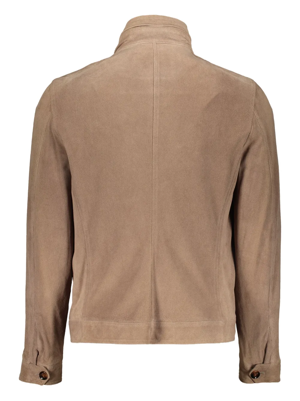Верблюжье-коричневого цвета, застежка на пуговицы спереди, два нагрудных кармана на пуговицах, два боковых кармана на молнии, воротник на кнопках