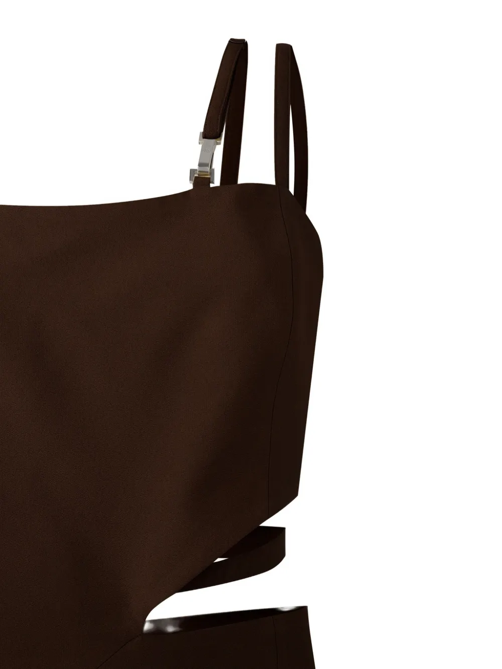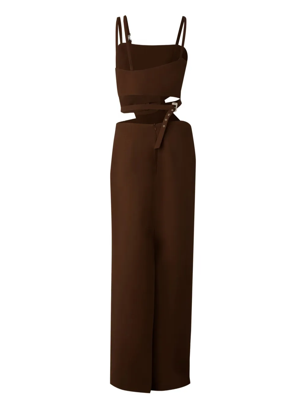 Шоколадно-коричневая потайная застежка-молния сзади, застежка на пряжку сзади, тонкие бретельки, вырезы