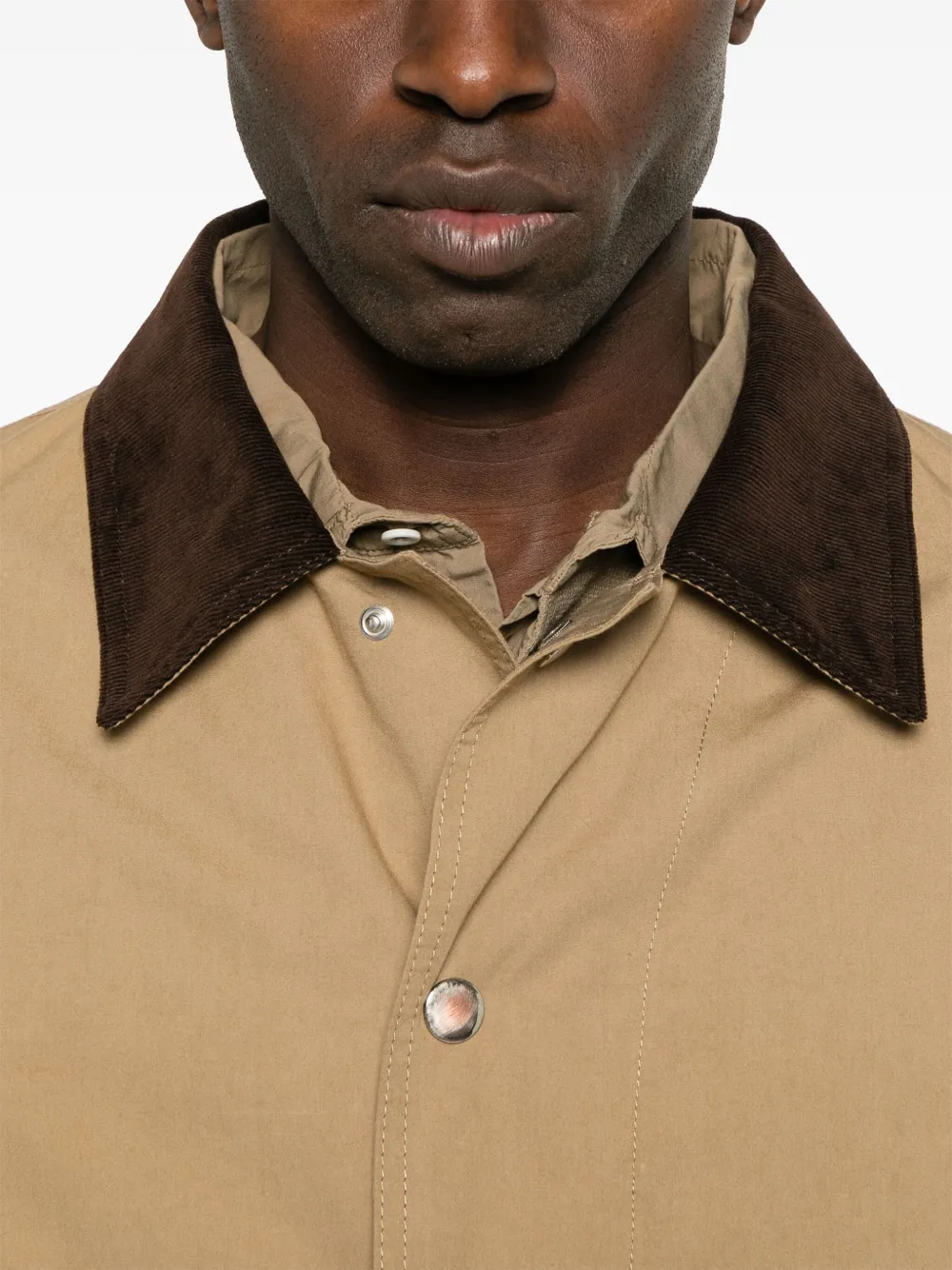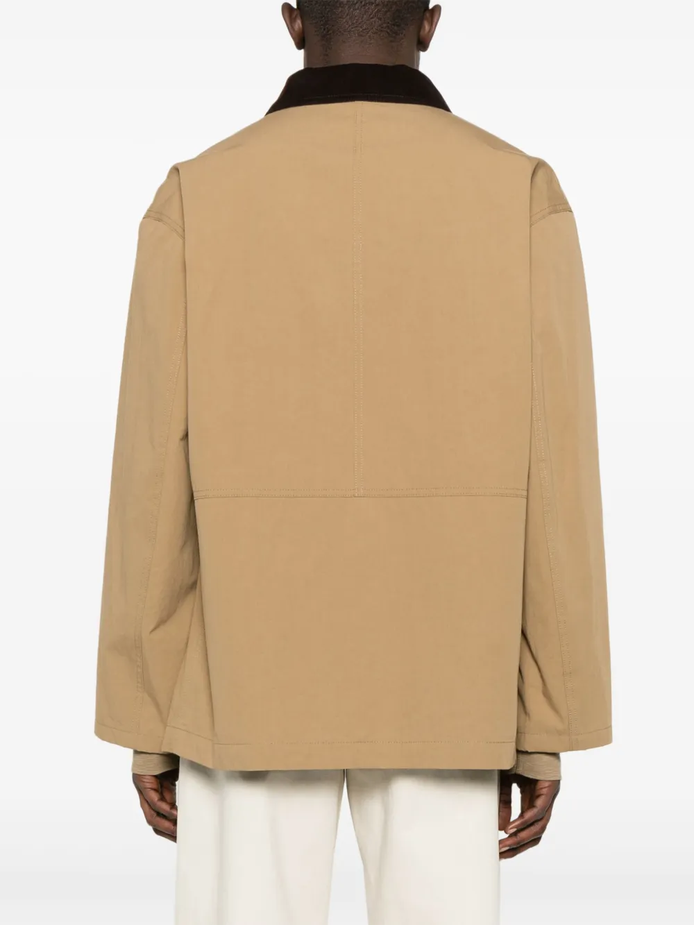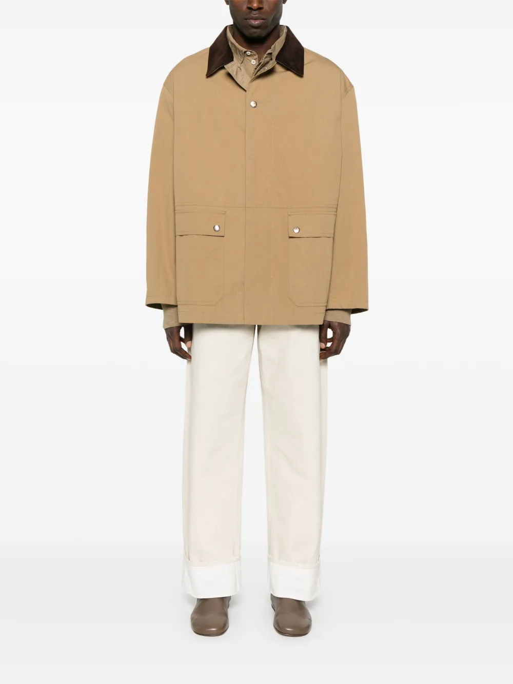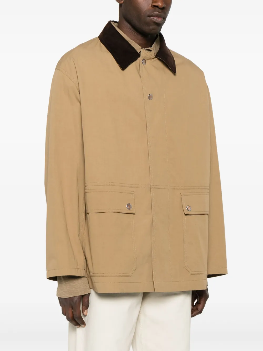 Светло-коричневая застежка на кнопку и молнию спереди, два кармана с клапанами спереди, длинные рукава