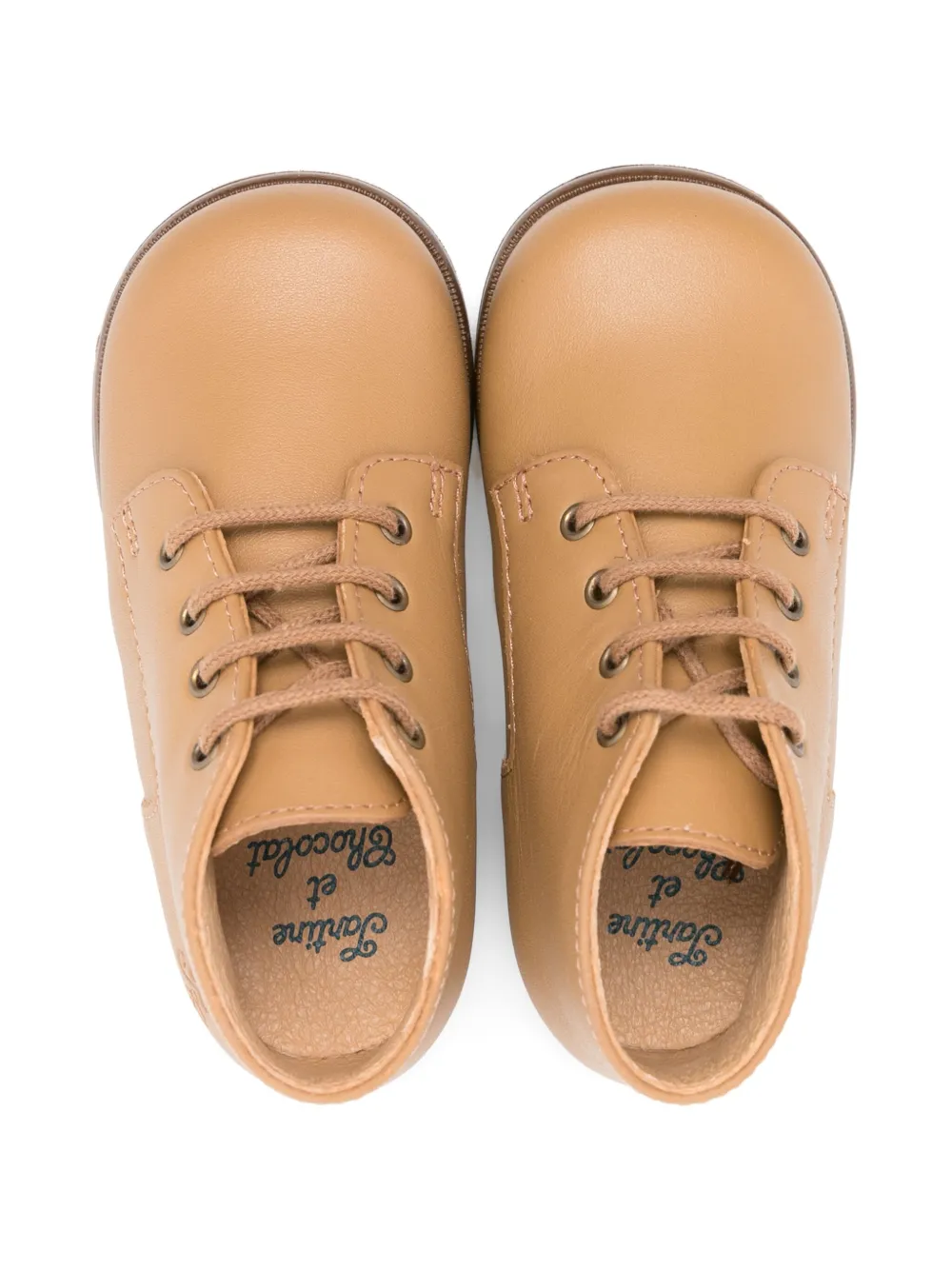 Верблюжье-коричневого цвета, шнуровка спереди, круглый носок, резиновая подошва