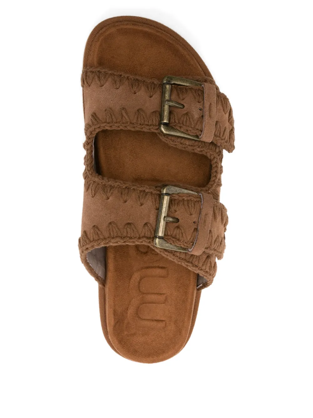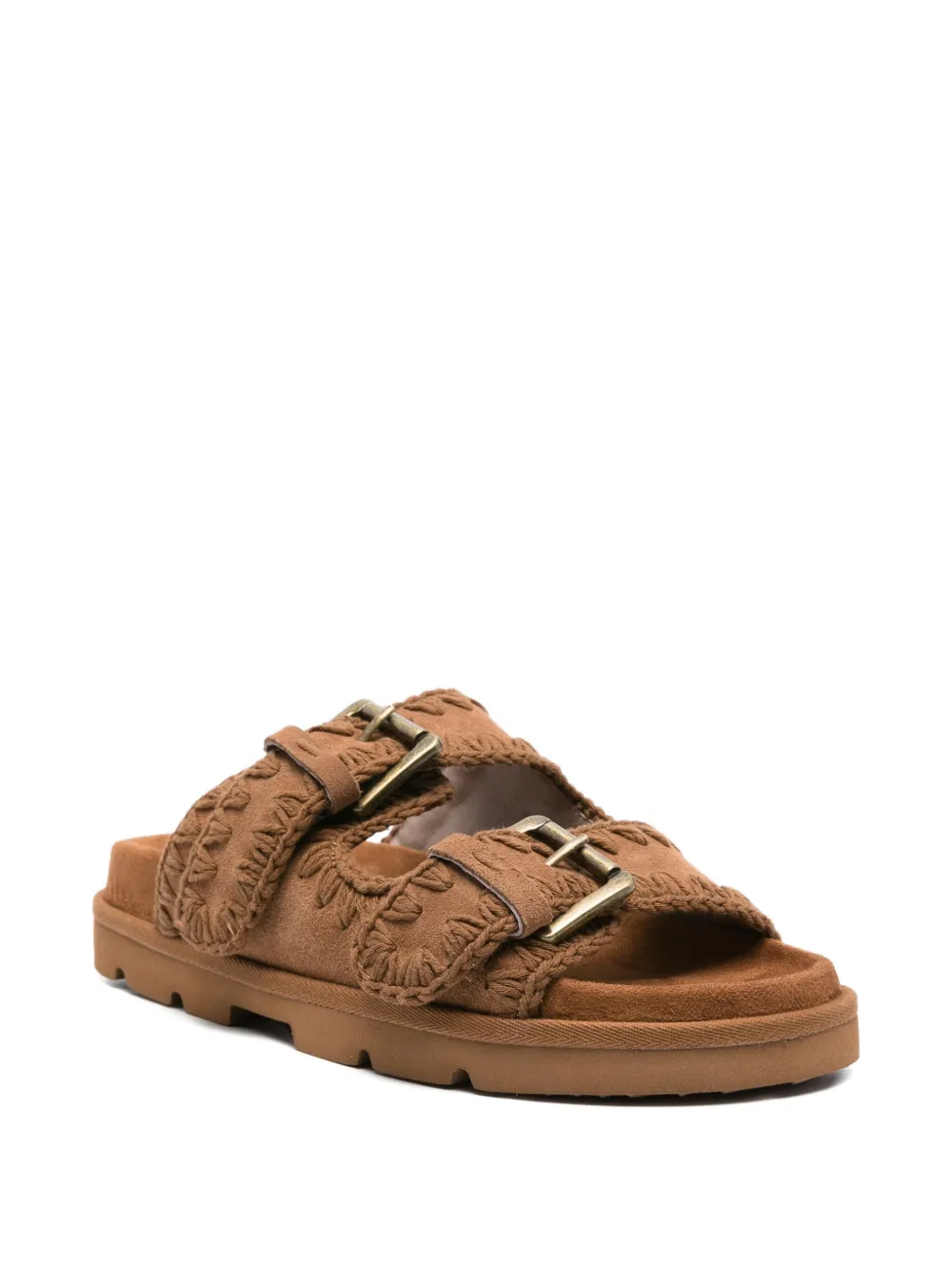 Замша коньячного цвета с двойной пряжкой, плоская подошва, открытый носок