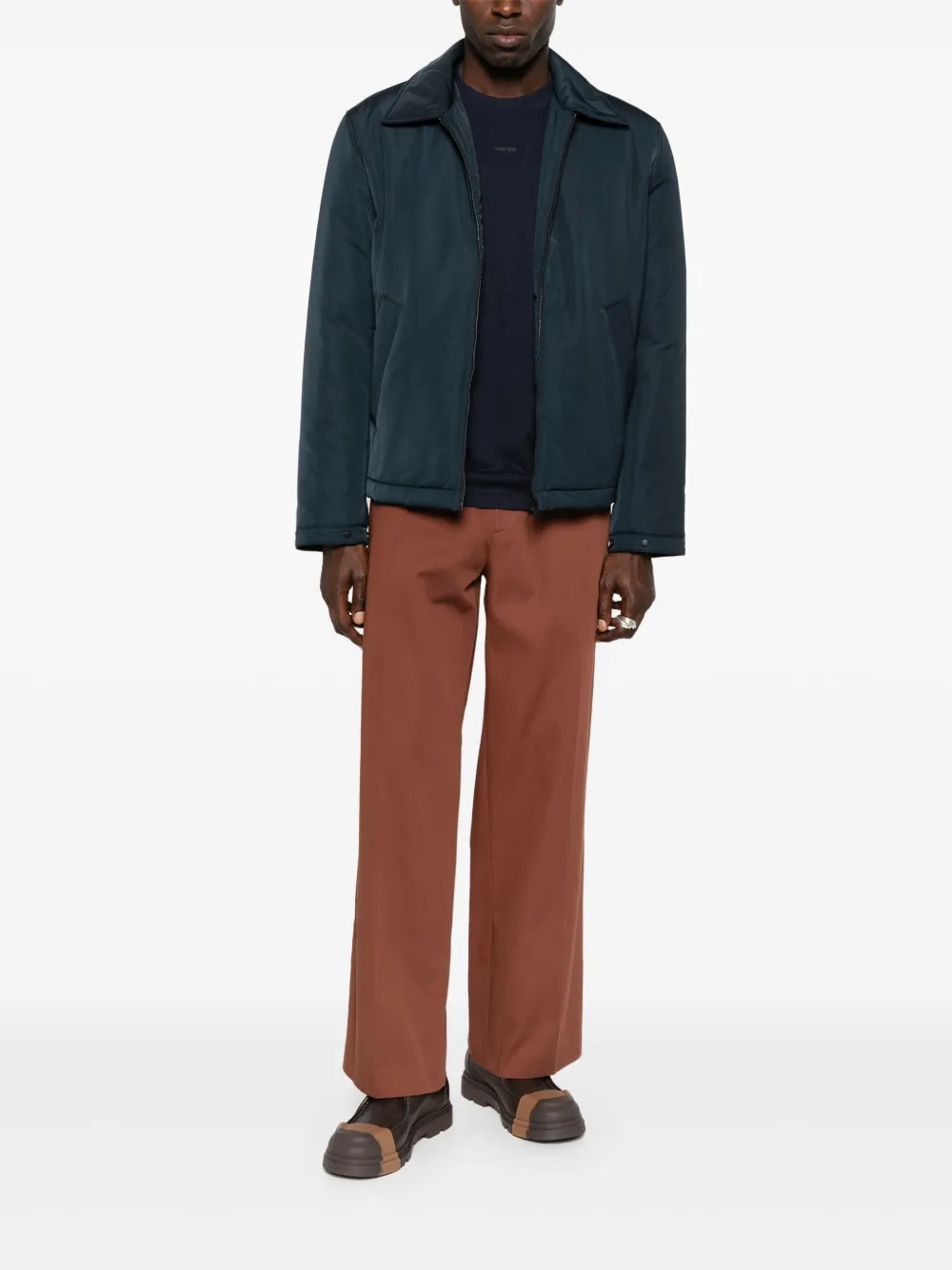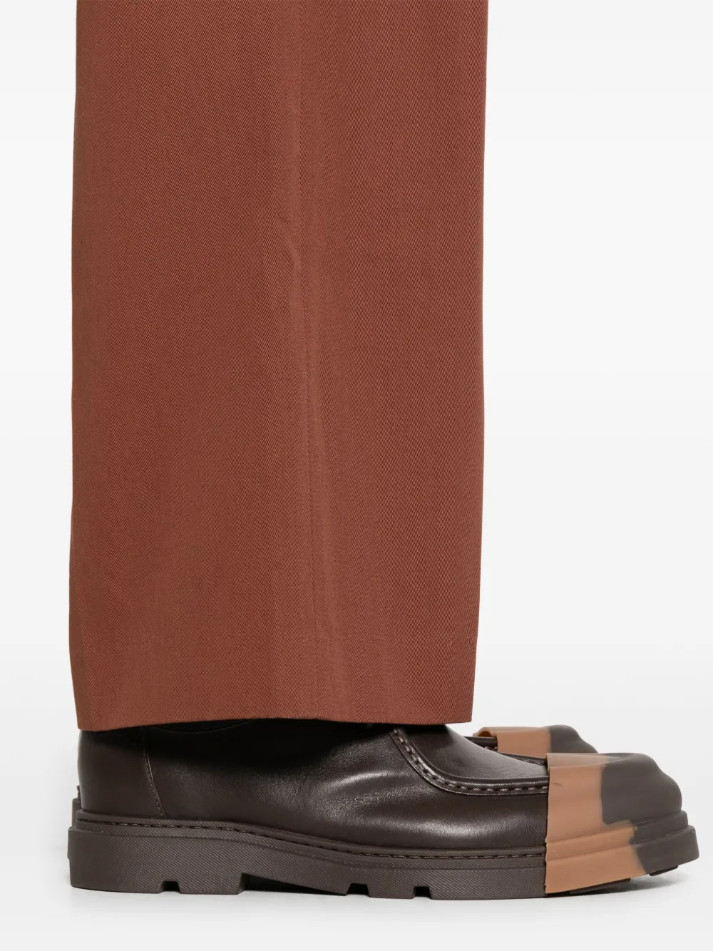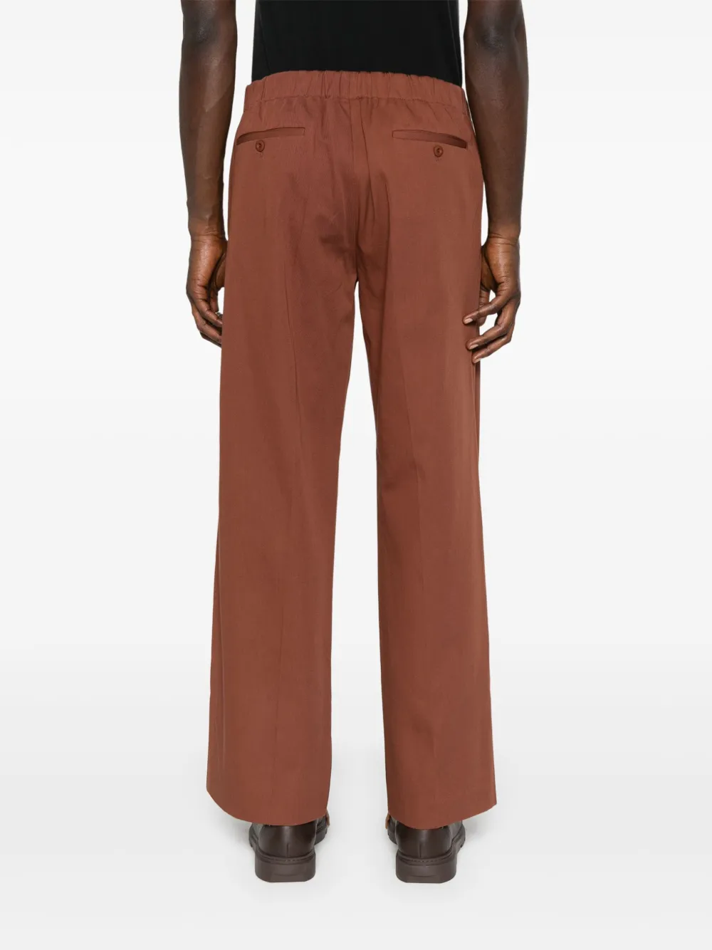 Эластичный пояс коньячно-коричневого цвета, два боковых кармана, два прорезных кармана на пуговицах сзади, укороченные штанины
