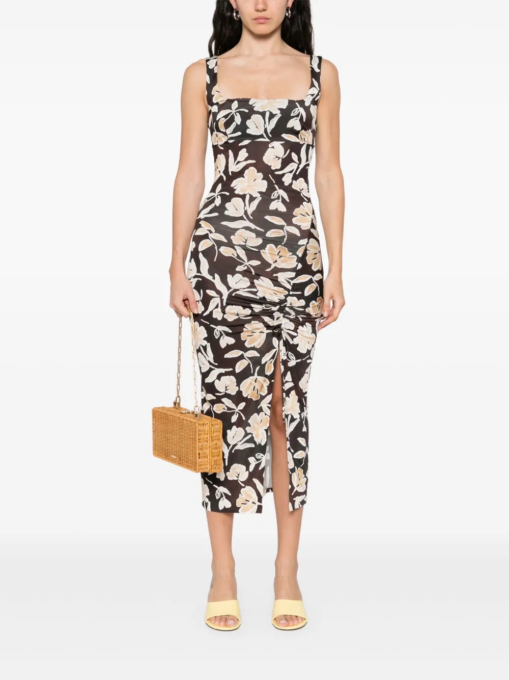 Черно-белый квадратный вырез, цветочный принт по всей поверхности, широкие бретели, разрез спереди