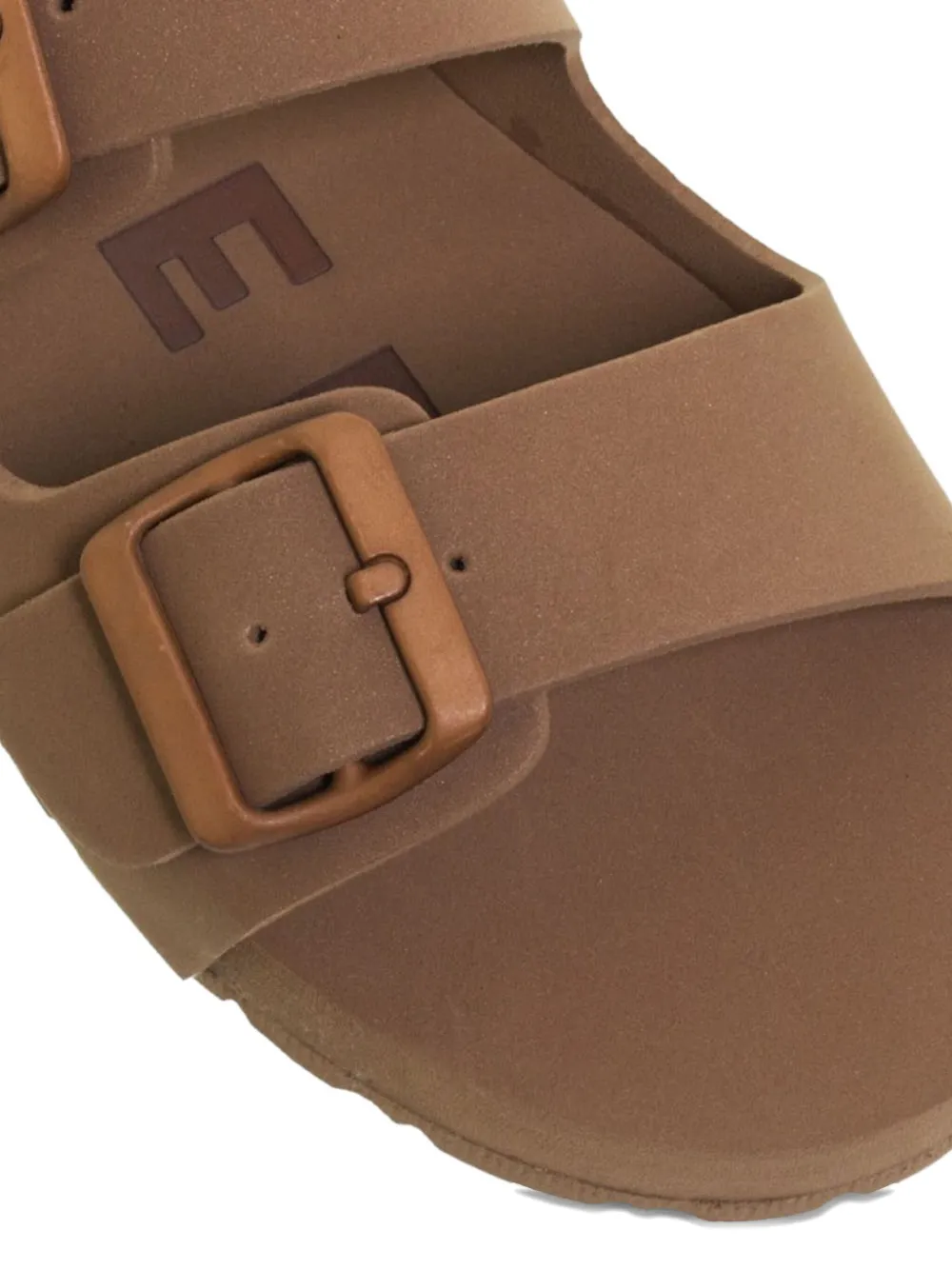 Коричневая застежка с двойной пряжкой, плоская подошва, открытый носок, текстурированная стелька, эмблема пальмы