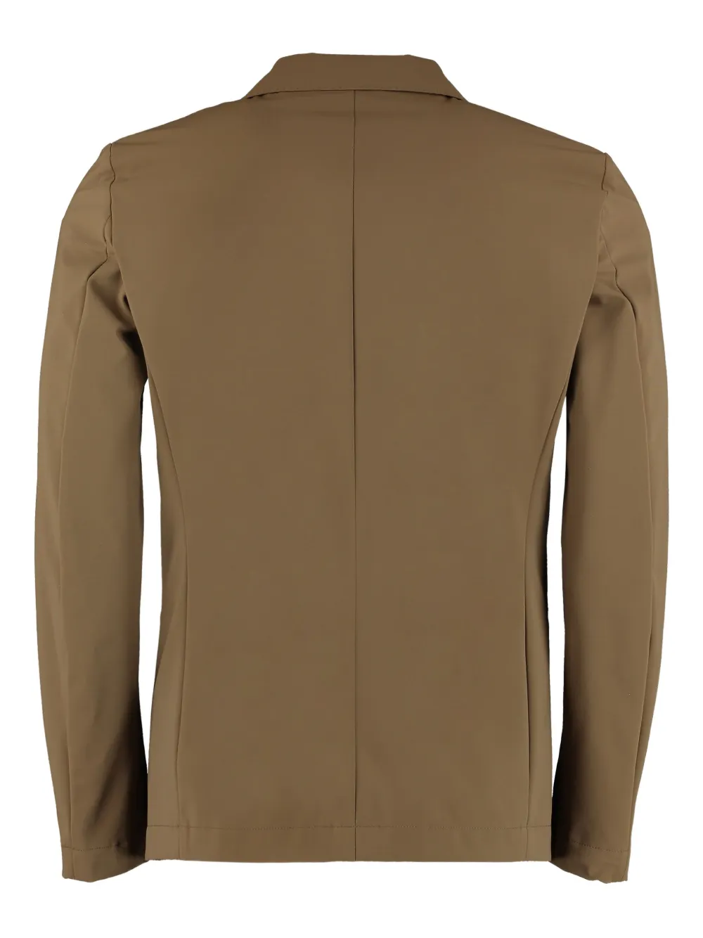 Коричневый однобортный пиджак с застежкой на две пуговицы, отложным воротником, длинными рукавами и прорезными карманами