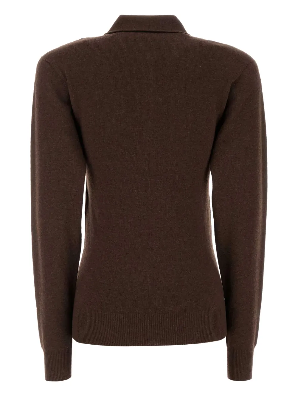 Коричневые длинные рукава, планка на пуговицах, ребристые манжеты, ребристый подол