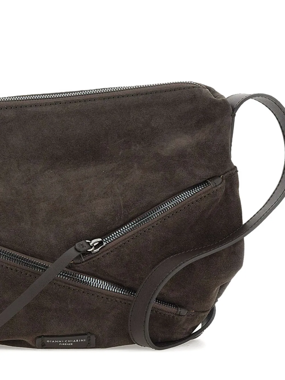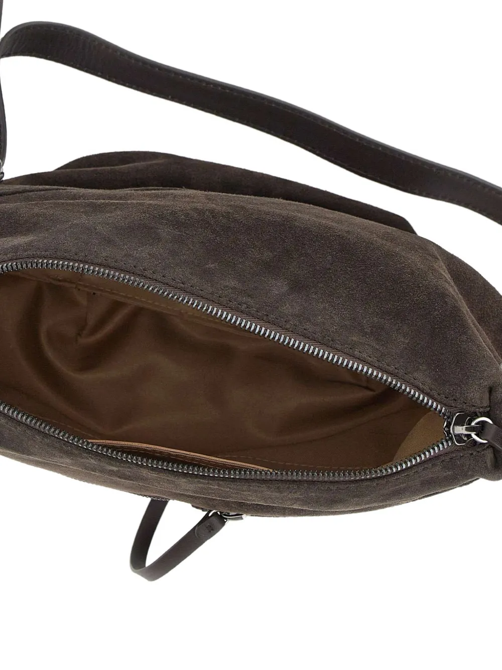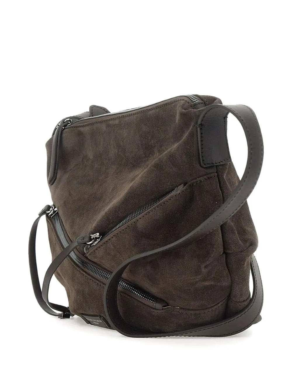 Темно-коричневая замша, застежка-молния, регулируемый ремешок, несколько отделений на молнии
